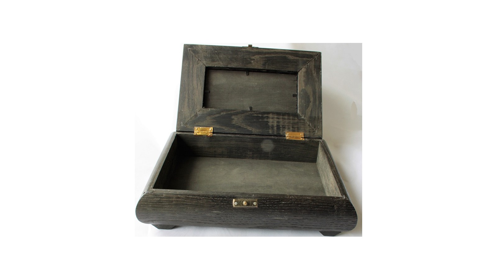 Oferujemy wyjątkowy przedmiot ozdobny - szkatułe wykonaną z czarnego dębu z ozdobą - jurajskim amonitem pochodzącym z Małopolski. Oznaczony na 1500 lat wiek dębu czarnego. Drewno czarne z subtelnym, zielonawym odcieniem. Certyfikat w formie skanu dokumentu dla kupującego. Dąb czarny jest szlachetnym materiałem, częściowo zmineralizowanym drewnem dębu, który w warunkach beztlenowych, pod wodą, uzyskuje swą czarną barwę w wyniku reakcji związków żelaza z garbnikami. Bywa używany do wyjątkowych realizacji (biżuteria, szlachetne meble, rzeźby, przedmioty rzemiosła artystycznego). Użyty amonit pochodzi zaś z okolic Krakowa. Obiekt dla osób ceniących przedmioty unikatowe. Wspaniały, szlachetny prezent dla wyjątkowej osoby. Może stanowić pojemnik na karty, biżuterię bądź osobiste drobiazgi. Przedmiot z duszą jakich nie powstanie zapewne wiele z uwagi na słabą dostępność surowca.