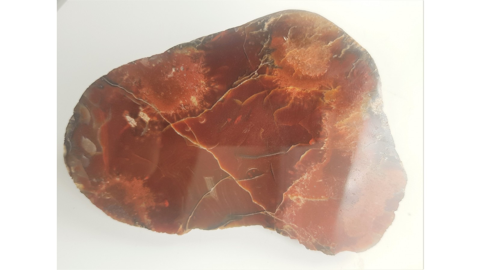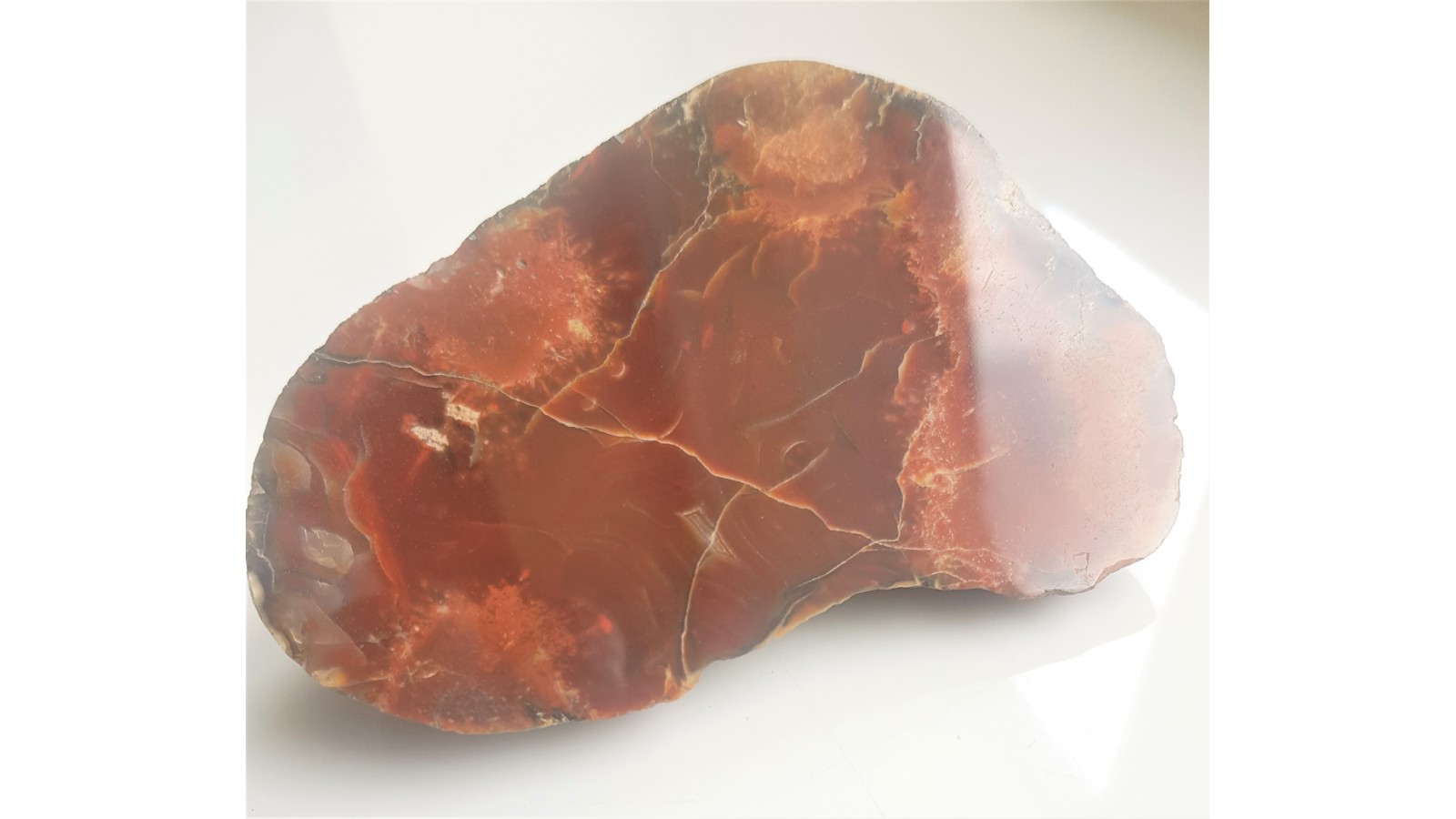Okaz prawdziwego karneolu. Barwa czerwona, delikatne pierścienie Lieseganga, przeświecający. Piękny poler. Okaz nieco spękany, lecz prawdziwe karneole (nie sardy bądź jaspisy) są w Sudetach rzadkością. Strona tylka naturalna, nie cięta. Okaz pochodzi z aluwiów Nysy Kłodzkiej, ze zbiornika Pilce.