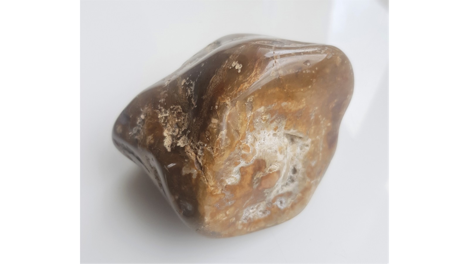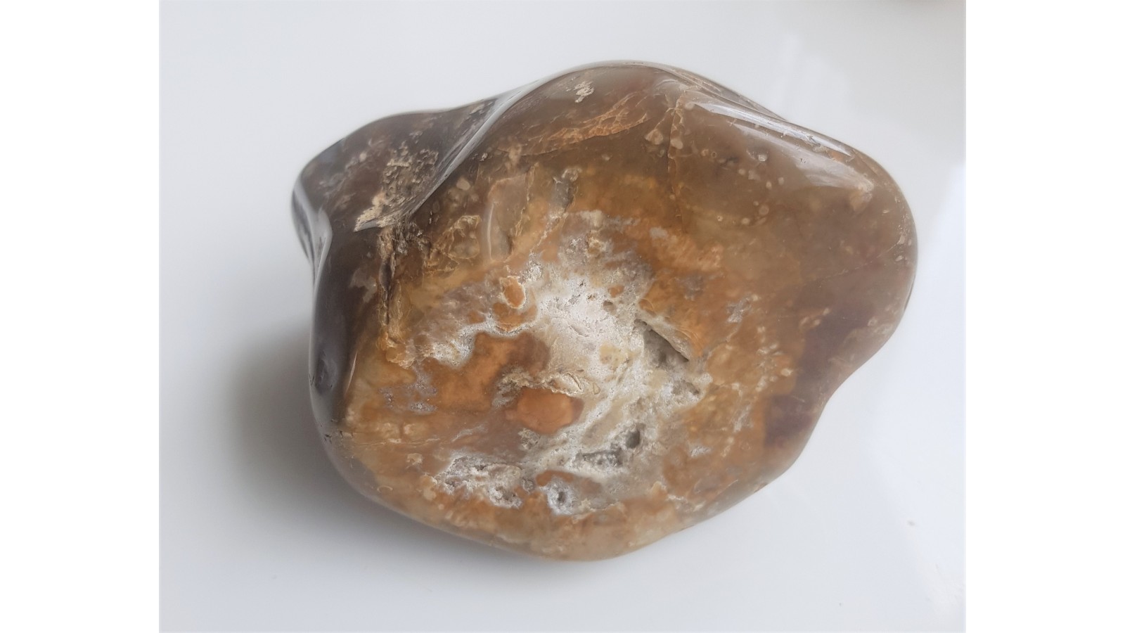Polerowany okaz krzemienia - gąbki z charakterystyczną strukturą. Okaz z Niżu Polskiego, bębnowany, duży.