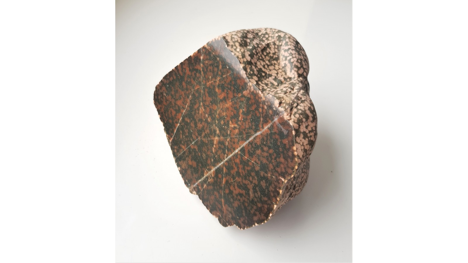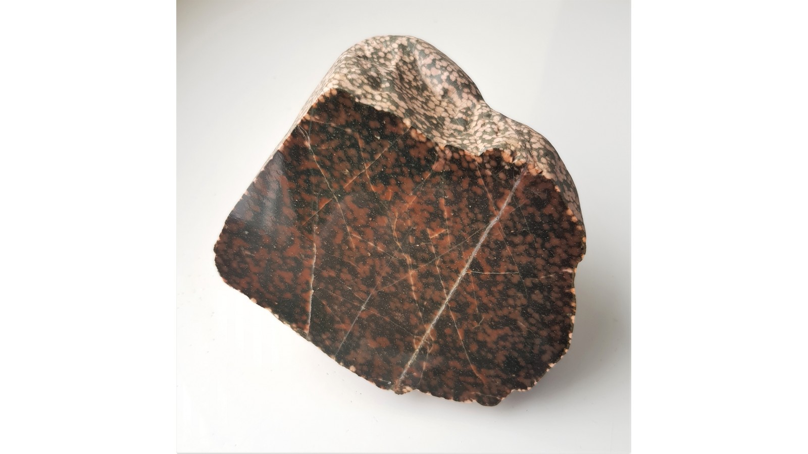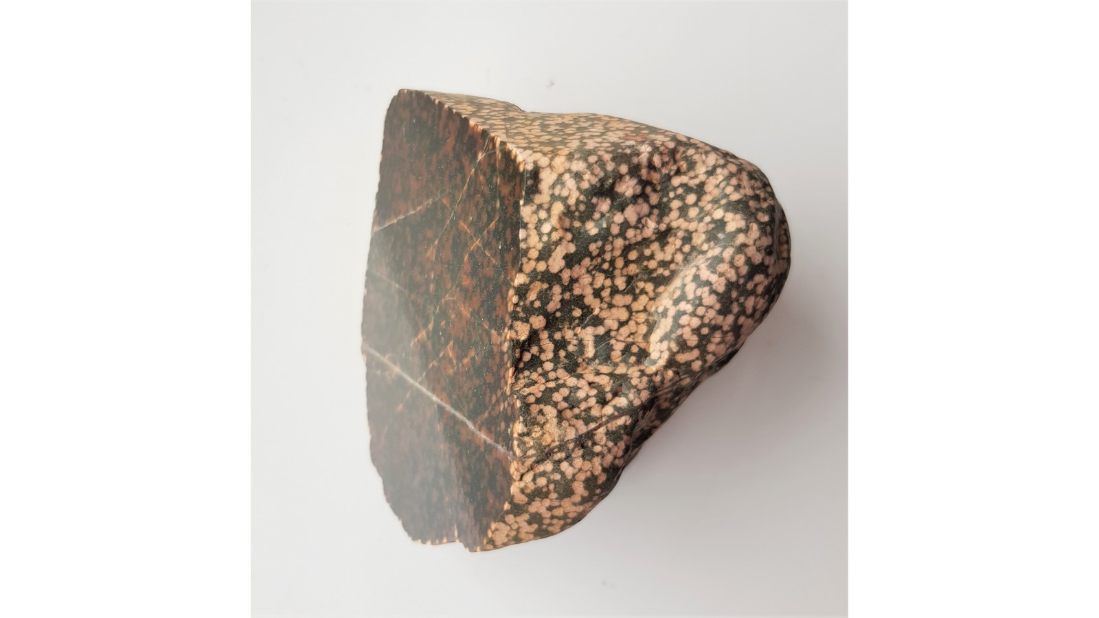 Polerowany, znacznej wielkości okaz adinolu z okolic Kamiennej Góry. Otoczaki tego rodzaju pochodzą najprawdopodobniej ze zlepieńców kulmu (dolny karbon) i są sporadycznie znajdowane na polach w okolicach Kaminej Góry oraz Wałbrzycha. Adinol to skała metamorficzna, powstała na kontakcie skał osadowych oraz skała zasadowych w wyniku oddziaływania związanych z nimi roztworów hydrotermnalnych niosących sód i krzemionkę. Tworzy się w spągu skał wylewnych bądź w pobliżu hipabisalnych żył skał zasadowych. Są to skały twarde, rogowcowe złożone głównie z kwarcu i albitu. Dawniej były opisywane przez badaczy niemieckich jako heliotropy. Piękna, zamknięta forma, doskonały poler, nakrapiana faktura. Rzadkość.