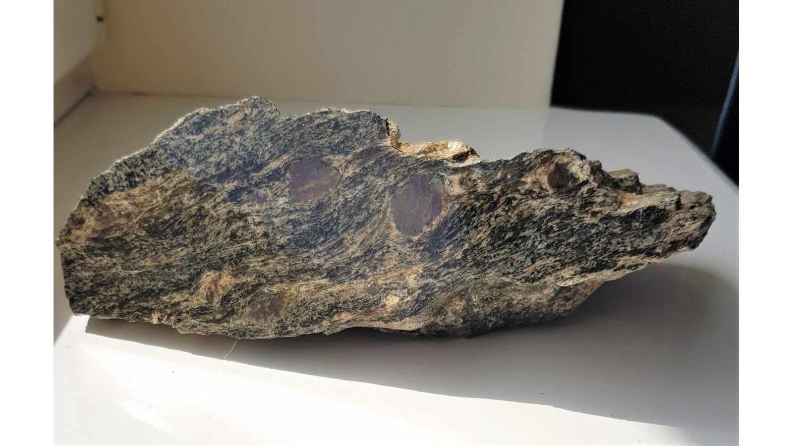 Okaz polerowanego łupku łyszczykowego z dużymi blastami (kryształami) granatów. Granaty widoczne na polerowanym przekroju skału oraz na powierzchni w postaci dużych zgrubień. Granaty ciemnoczerwone. Łupek masywny, piękny poler. Okaz z Kamieńca Ząbkowickiego. Unikatowo duże granaty po około 2 cm średnicy. Polecam.