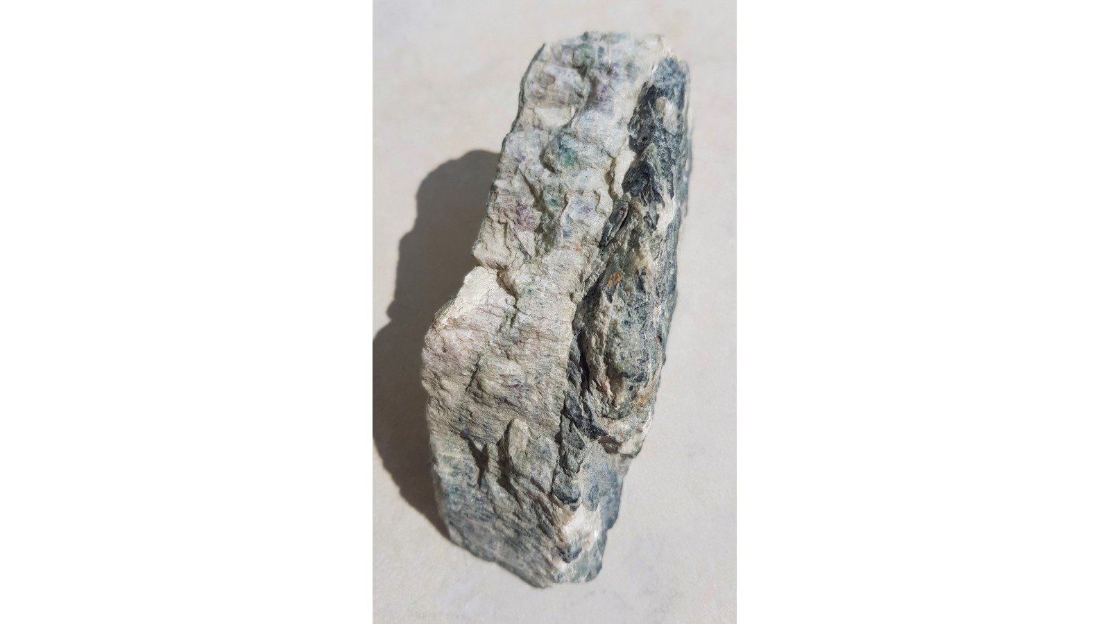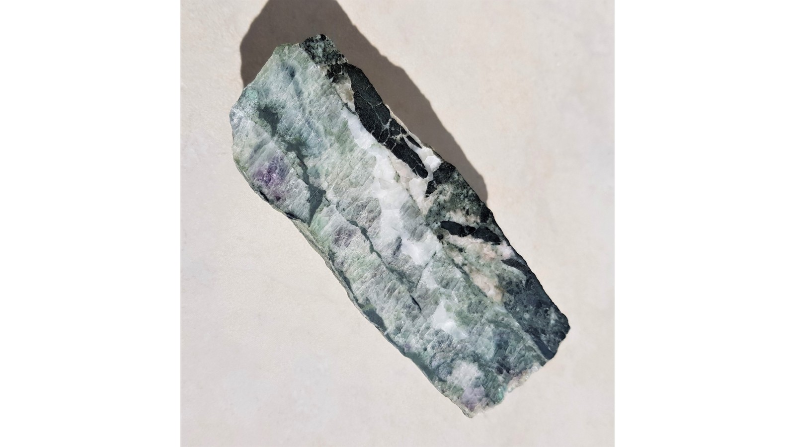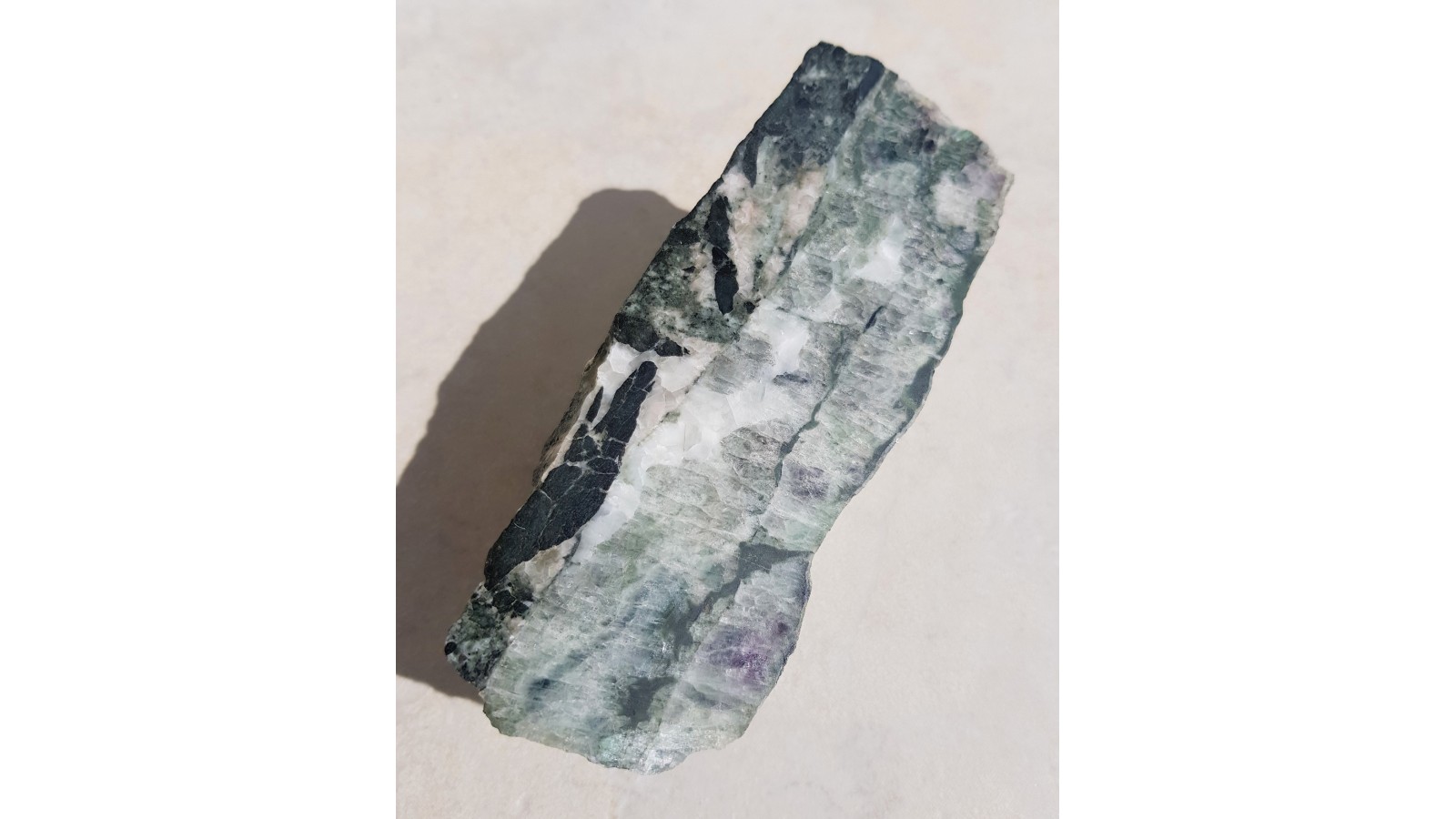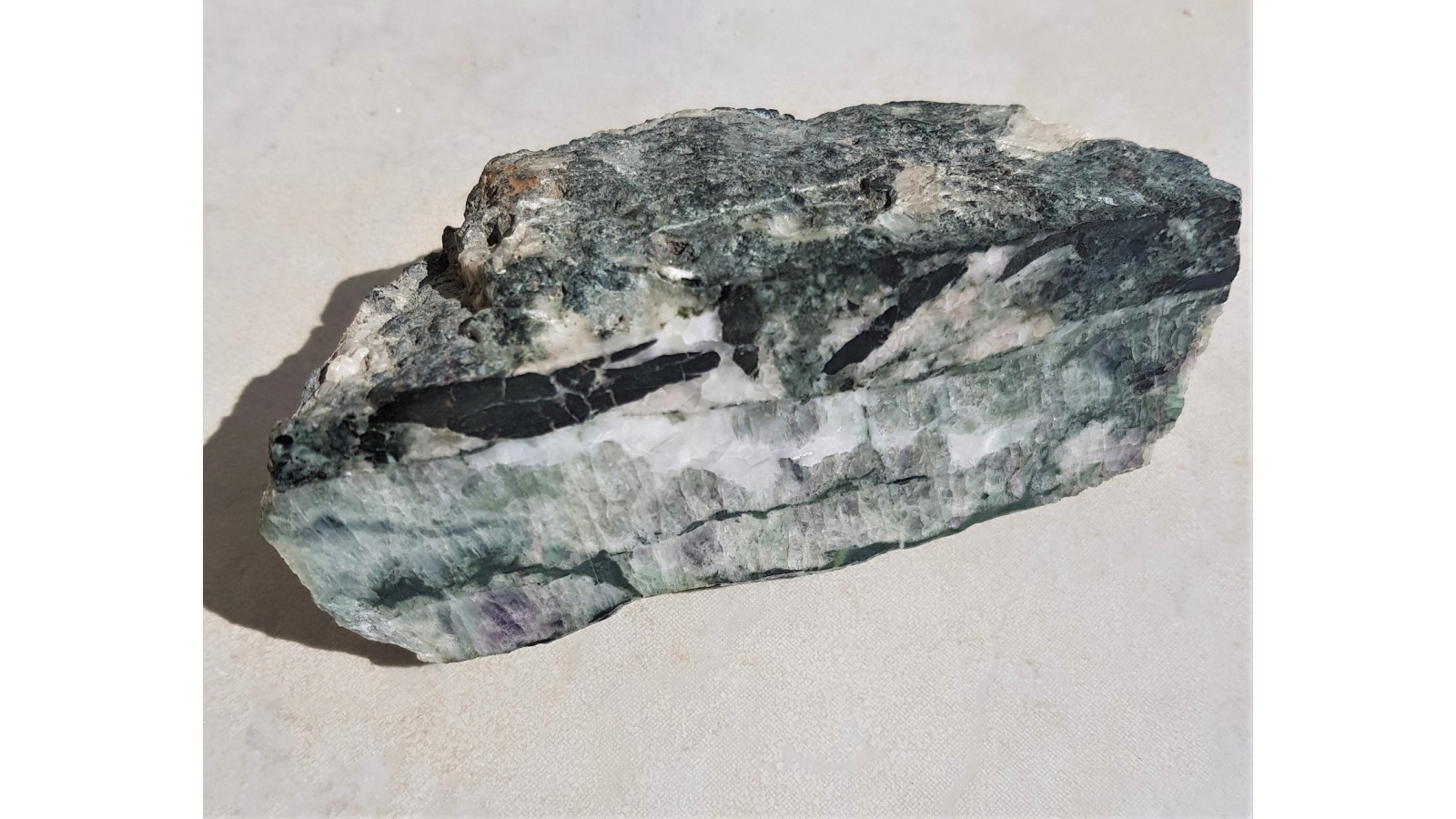 Miąższa żyła fluorytu z Ciechanowic (pole górnicze Miedzianki). Okaz polerowany, strona przecwna naturalna, nie cięta. Fluoryt w barwie zielonej z centrami delikatnie fioletowymi, z wrostkami minerałów rudnych. Żyła kompletna, pełny przekrój, masywna. Rzadkość z Ciechanowic.