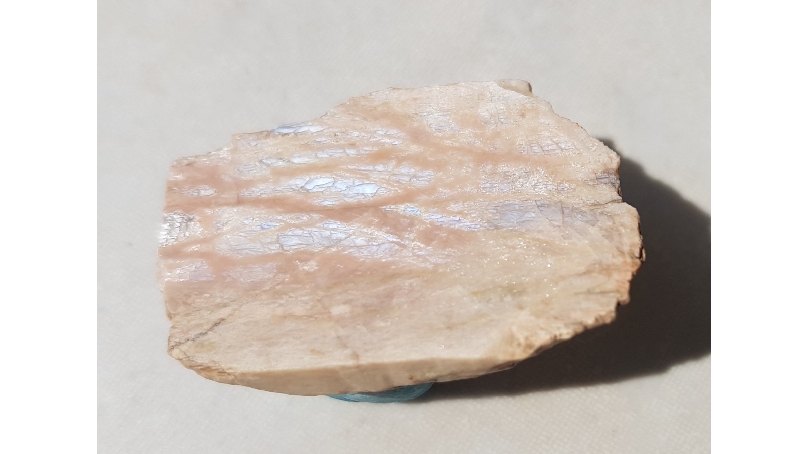 Polerowany okaz kamienia księżycowego z Łomnicy k. Jeleniej Góry. Strona przeciwna naturalna, nie cięta. Bardzo wyraźny efekt adularescencji w barwie błękitnej - piękna poświata. Okazy kamienia książycowego są obecnie wielką rzadkością z powodu wieloletniej eksploatacji ich wystąpień przez kolekcjonerów. Kolekcjonerzy zliczyli łącznie około 20-tu niewielkich wystąpień tego rzadkiego kamienia ozdobnego, mineralogicznej "wizytówki" okolic Jeleniej Góry.