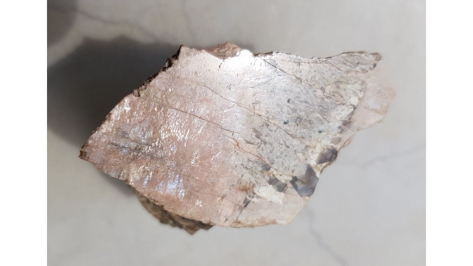 Polerowany okaz kamienia księżycowego z Łomnicy k. Jeleniej Góry. Strona przeciwna naturalna, nie cięta. Wyraźny efekt adularescencji w barwie błękitnej oraz miedzianej - piękna poświata. Widoczna granica kamienia księżycowego i kamienia hebrajskiego, co czyni kamień wyjątkowym. Okazy kamienia książycowego są obecnie wielką rzadkością z powodu wieloletniej eksploatacji ich wystąpień przez kolekcjonerów. Kolekcjonerzy zliczyli łącznie około 20-tu niewielkich wystąpień tego rzadkiego kamienia ozdobnego, mineralogicznej "wizytówki" okolic Jeleniej Góry.