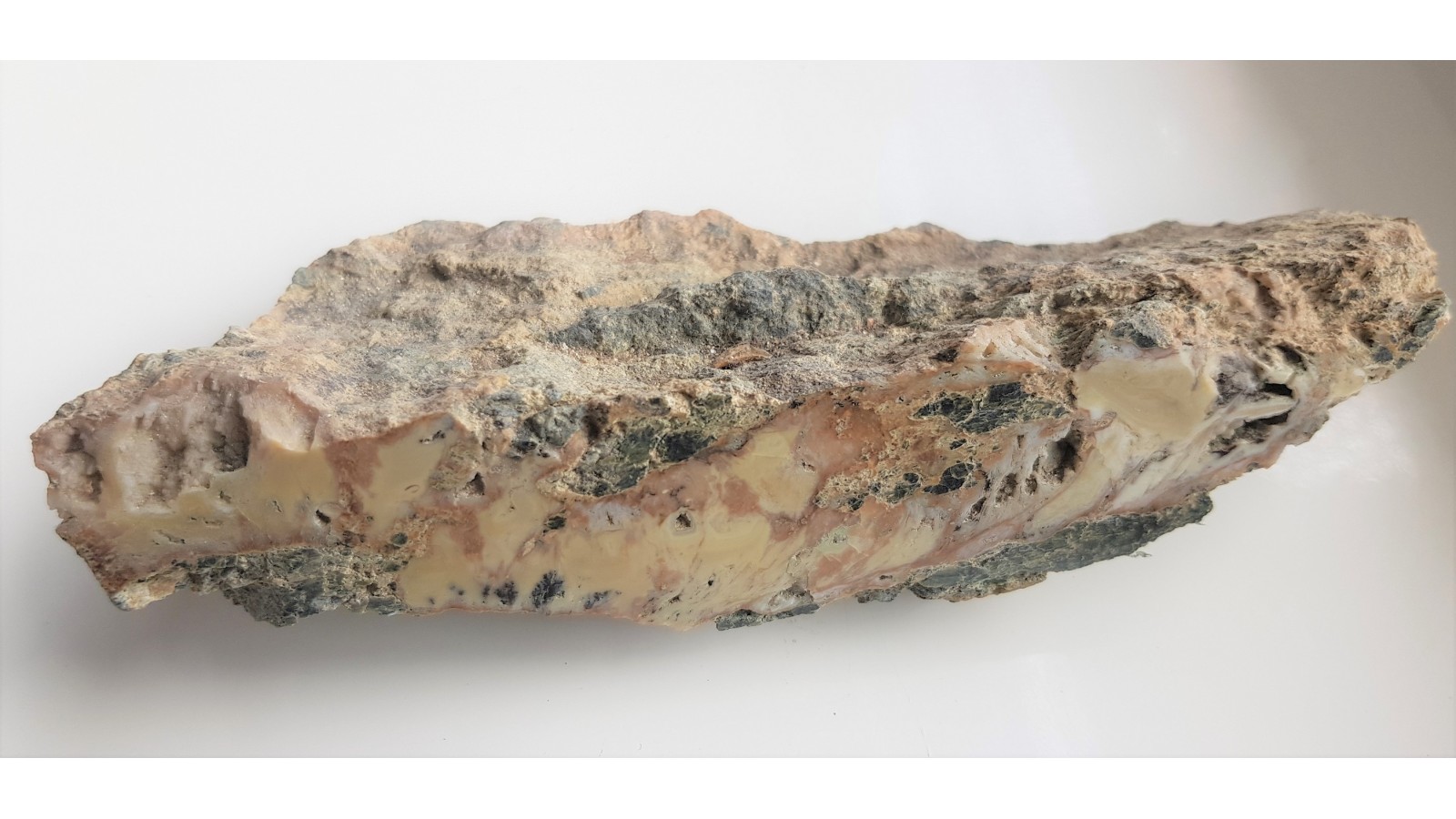 Żyła żółto-kawowego opalu w serpentynicie z Jordanowa Śląskiego. Na przekroju widoczne struktury naciekowe. Okaz z jednej strony polerowany, dosyć duży. Piękne, wyraziste barwy. Strona przeciwna naturalna, nie cięta.