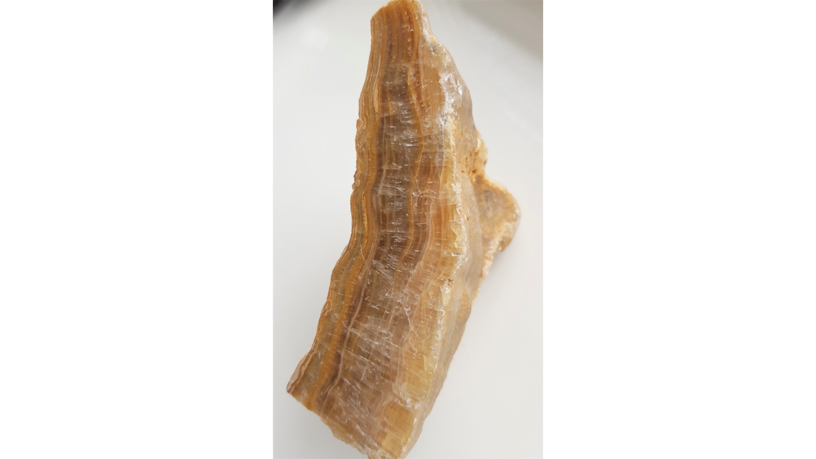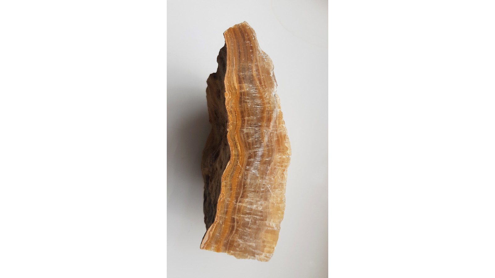 Okaz polerowanej polewy jaskiniowej z Raciszyna k. Działoszyna (Jura Krakowsko-Wieluńska). Widoczna piękna promienista struktura narastających kryształów kalcytu na bazie żyłkowanej polewy. Okaz w barwach miodowych, sprzed wielu lat. Świetny poler.
