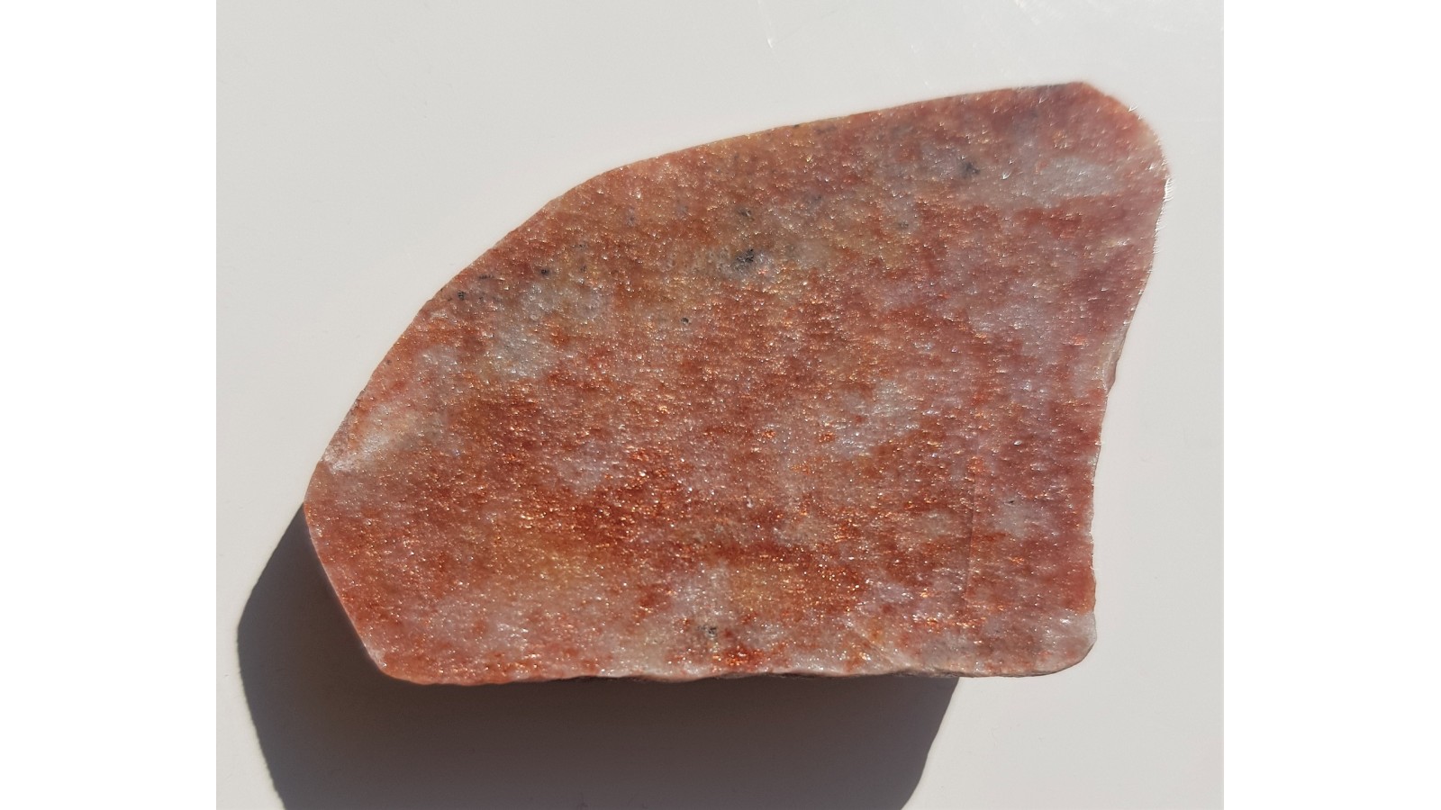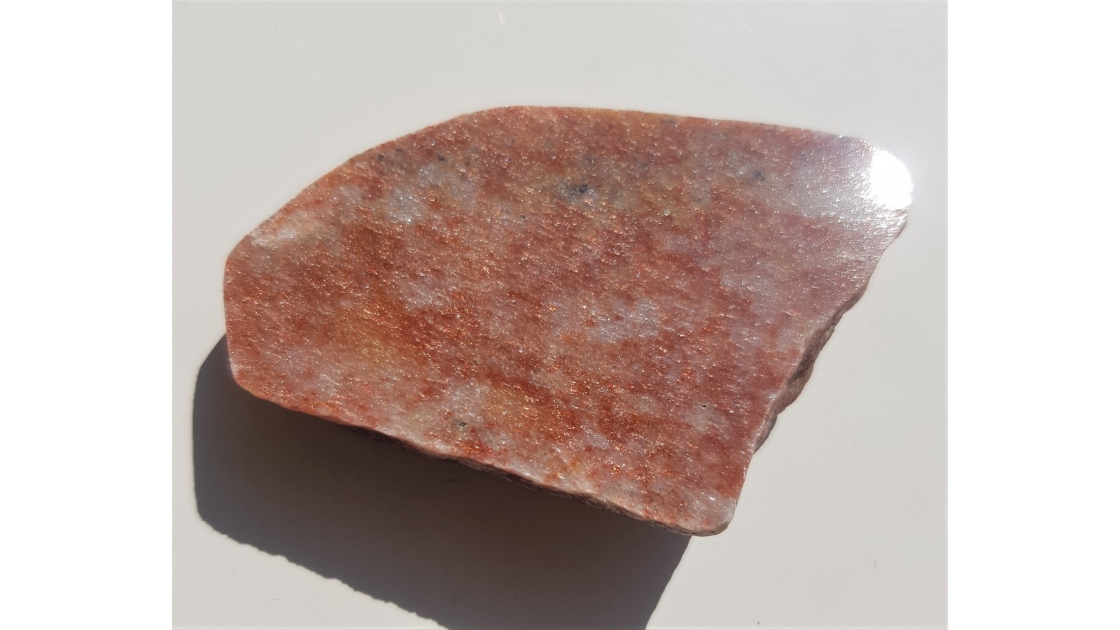 Polerowana płytka intensywnie świecącego awenturynu z wyjątkowego znaleziska w Jegłowej. Znalezisko sprzed około 10-ciu lat. Okazy z dawnych hałd z okolicy wyrobiska łupków kwarcytowych. Znalezisko autorskie, słabo znane wśród kolekcjonerów i pasjonatów kamieni odzobnych Sudetów.