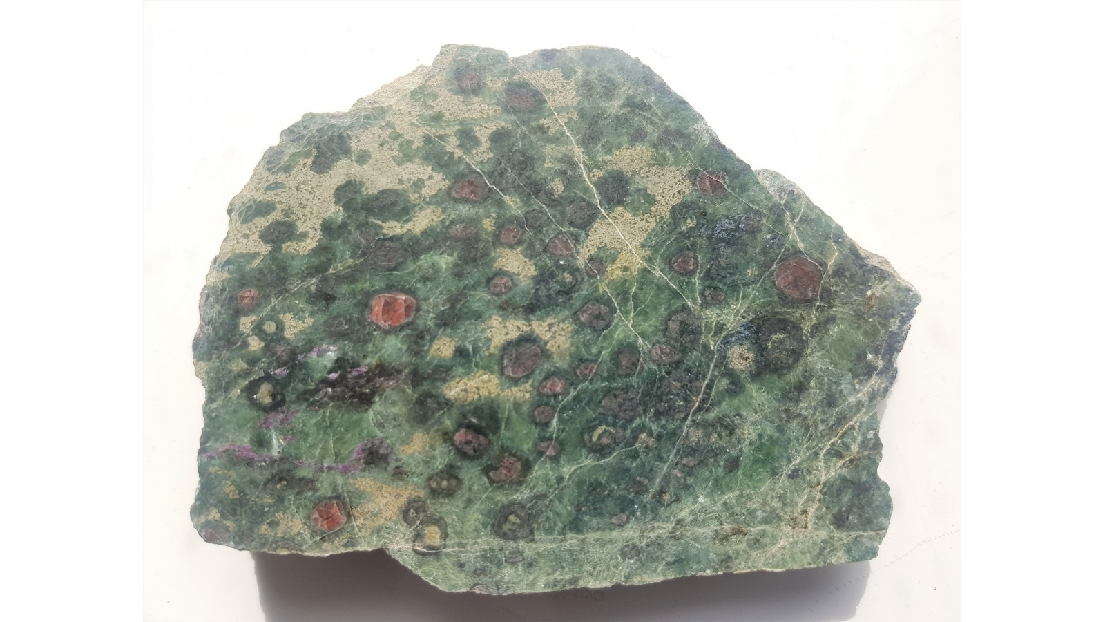 Okaz eklogitu z wrostkami rubinu. Rubiny intensywnie czerwone, świecą w UV w odróżnieniu od granatów także obecnych w skale. Okaz z pięknym polerem. Rzadkość z Sudetów. Lokalizacja: Bystrzyca Grn.
