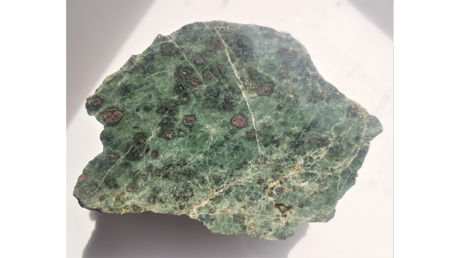 Okaz intensywnie zielonego eklogitu z pięknymi granatami z Bystrzycy Górnej. Okaz ze świetnym polerem. Strona przeciwna naturalna, nie cięta.