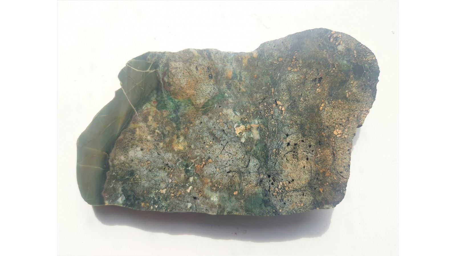 Okaz zielonego jaspisu z okolic Kamiennej Góry. Okaz w odcieniach zieleni z reliktowymi teksturami skały magmowej (relikty skaleni, łyszczyków etc.). Okaz niespękany, piękny plaster. Polecam.