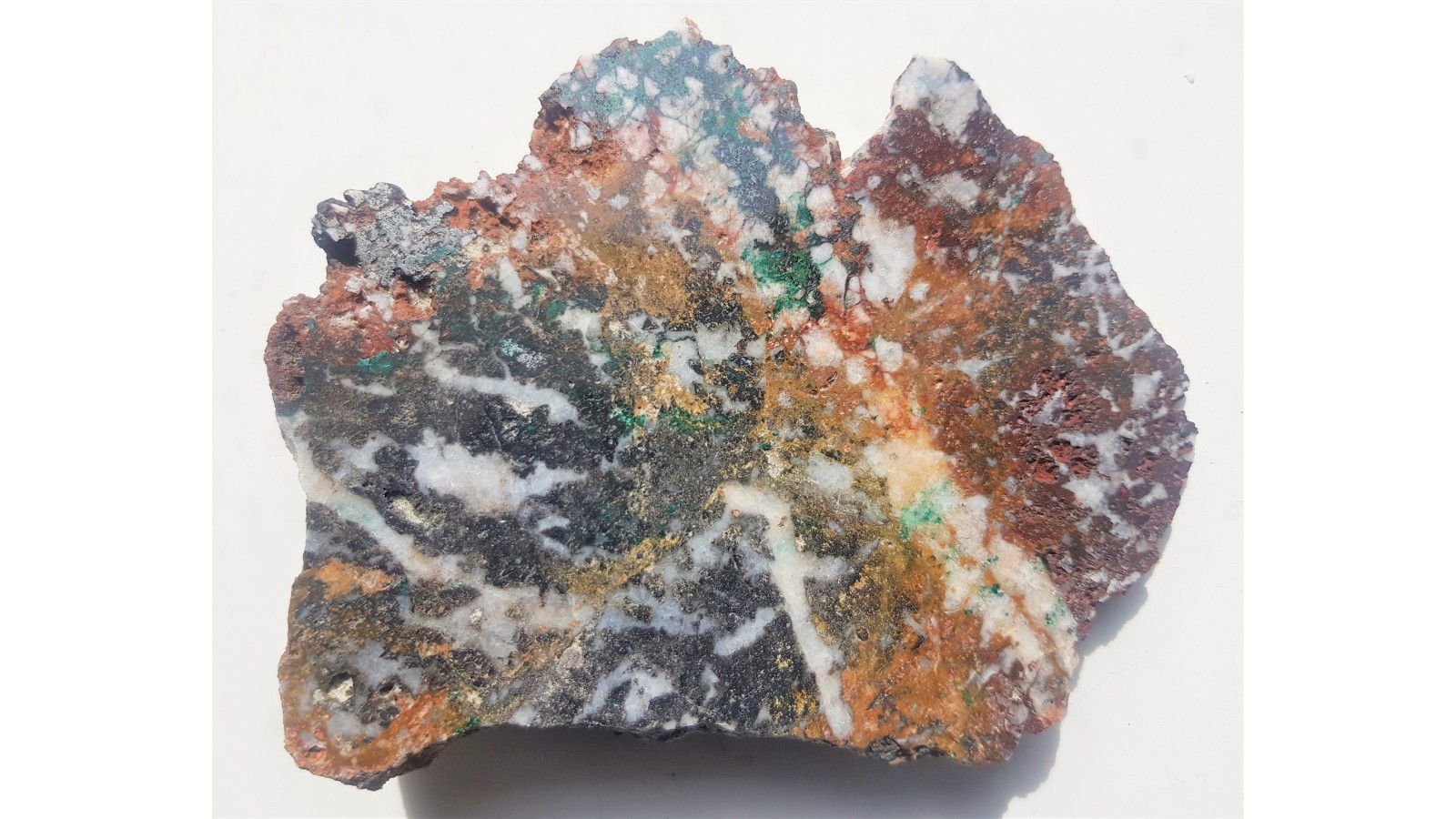 Polerowany okaz malachitu w żyle rudnej z kwarcem i żelaziakiem brunatnym z okolic Chełmca k. Jawora. Wtrącenia malachitu o pięknej, szmaragdowozielonej barwie. Żywe barwy na całej polerowanej powierzchni.