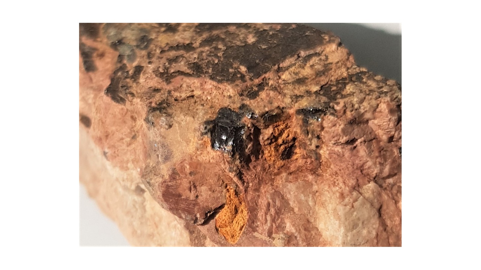 Fergusonit (o smolisto-szklistym połysku) oraz monacyt jako brązowe tabliczki w kilku miejscach próbki ze Wzgórza Skalna Brama k. Szklarskiej Poręby. Unikatowe minerały ziem rzadkich z Karkonoszy w jednym okazie. Szczególnie polecam kolekcjonerom rzadkich minerałów Sudetów.