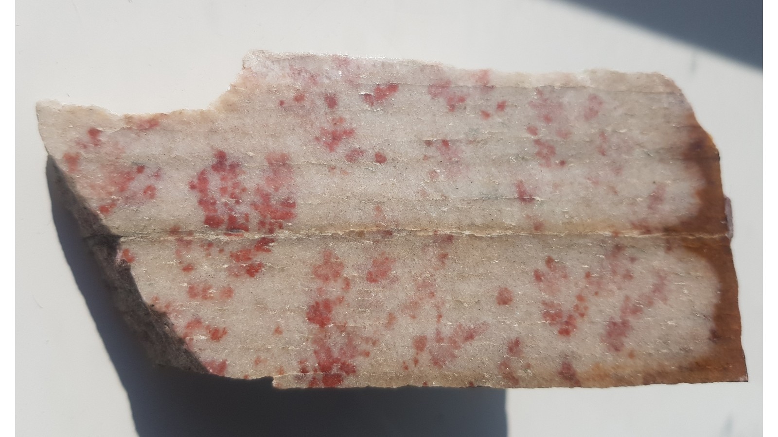 Dewoński kwarcyt z wyjątkowymi, czerwonymi strukturami przypominającymi dendryty. Tło skały jasne, niemal białe, kontrastowy, wyrazisty deseń. Okaz polerowany jednostronnie. Strona przeciwna naturalna, nie cięta. Okaz z Głuchołaz w Sudetach Wschodnych.