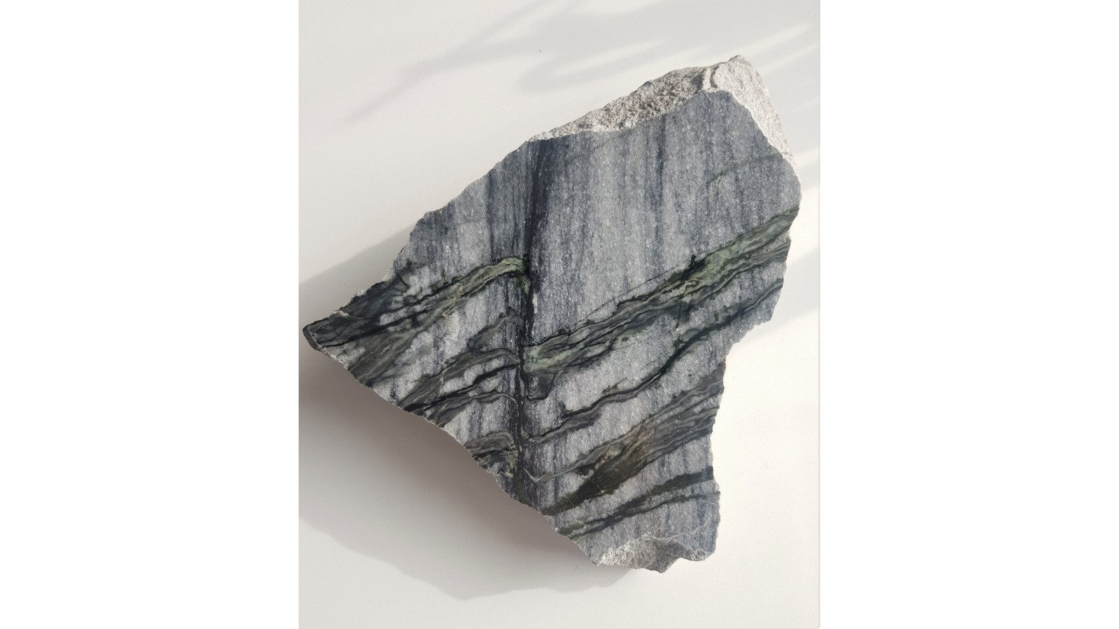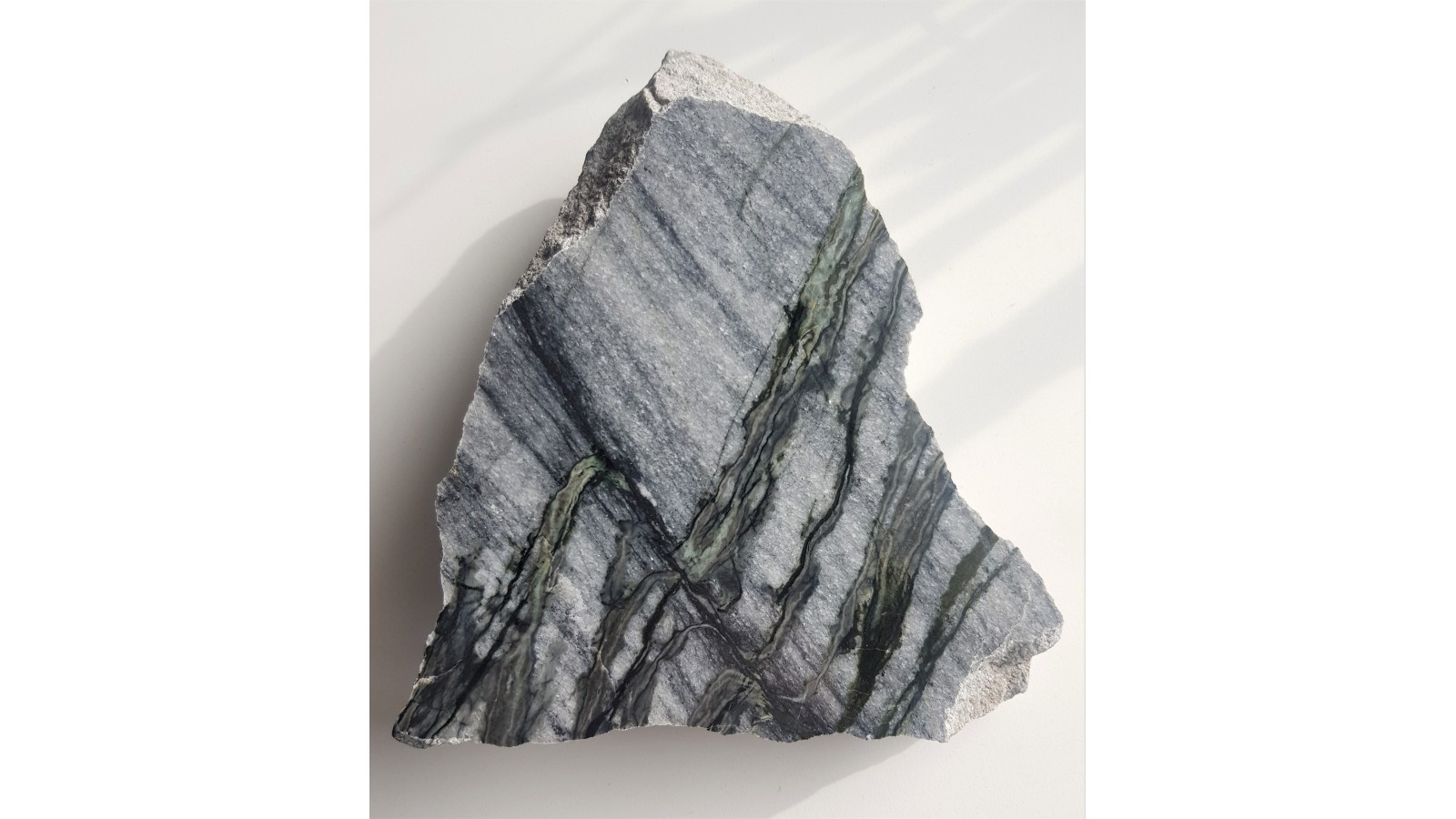 Okaz dolomitu ze Złotego Stoku z pięknie widocznym uskokiem i "ciągniętymi" za uskokiem żyłami minerałów z grupy serpentynu. Piękny deseń. Okaz dokumentujący współwystępowanie procesów metasomatozy z zaburzeniami tektonicznymi. Okaz polerowany jednostronnie, strona przeciwna naturalna, nie cięta.