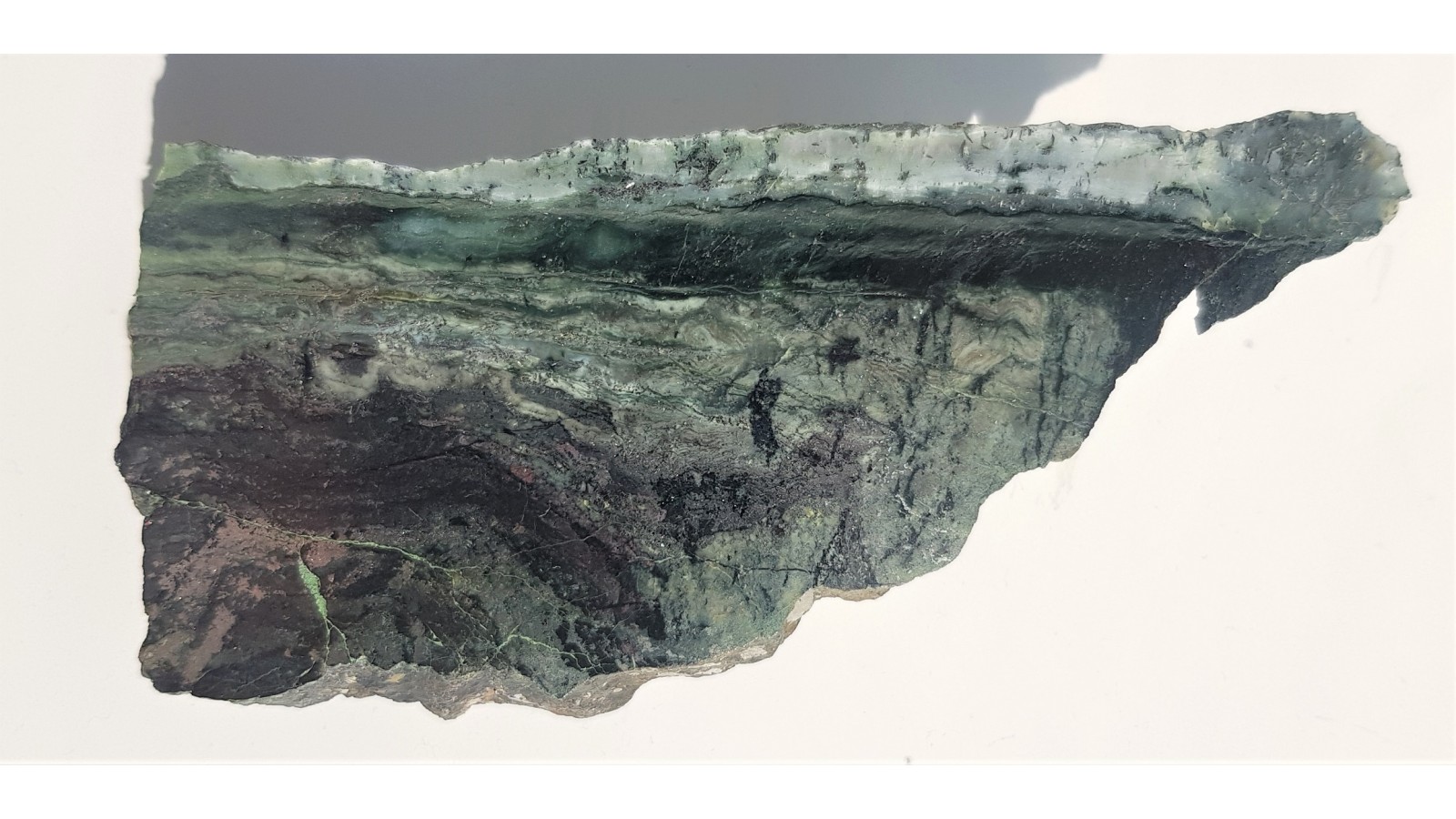 Przerosty - pasma nefrytu w okruszcowanym skarnie złotostockim. Okaz polerowany. Widoczne małe kryształki arsenopirytu, co jest cechą charakterystyczną okazów ze Złotego Stoku. Rzadkość mineralogiczna.