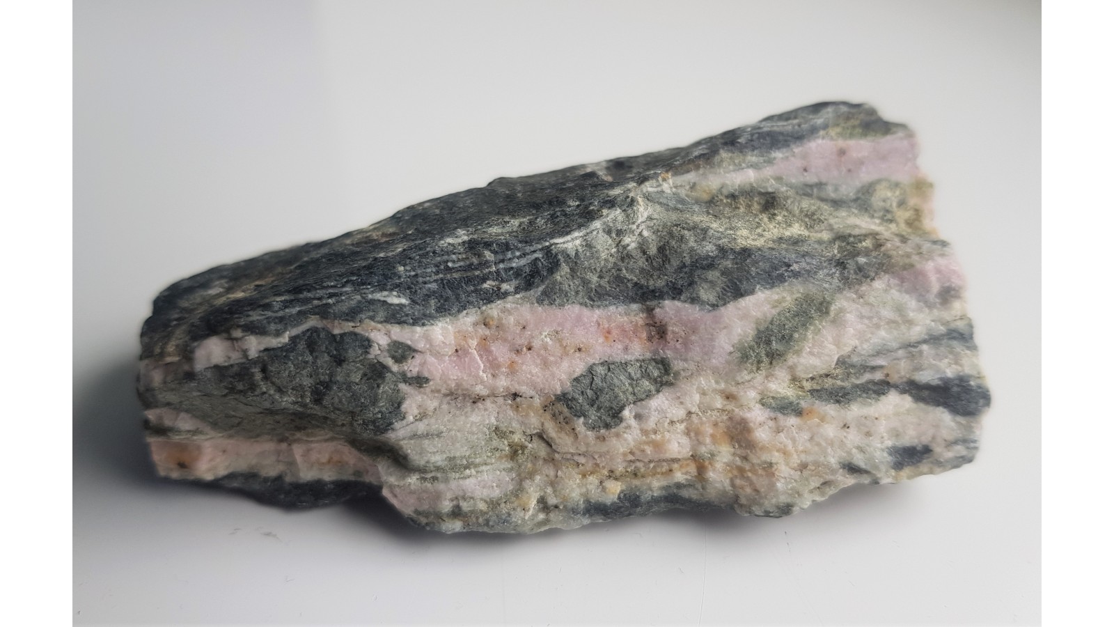 Okaz gabra z zsaussurytyzowanymi plagioklazami. W efekcie ich rozkładu powstaje m.in. różowy zoisyt. Okaz nie cięty, nie polerowany. Z kamieniołomu gabra w Braszowicach. Ładna barwa żyłek z zoisytem.