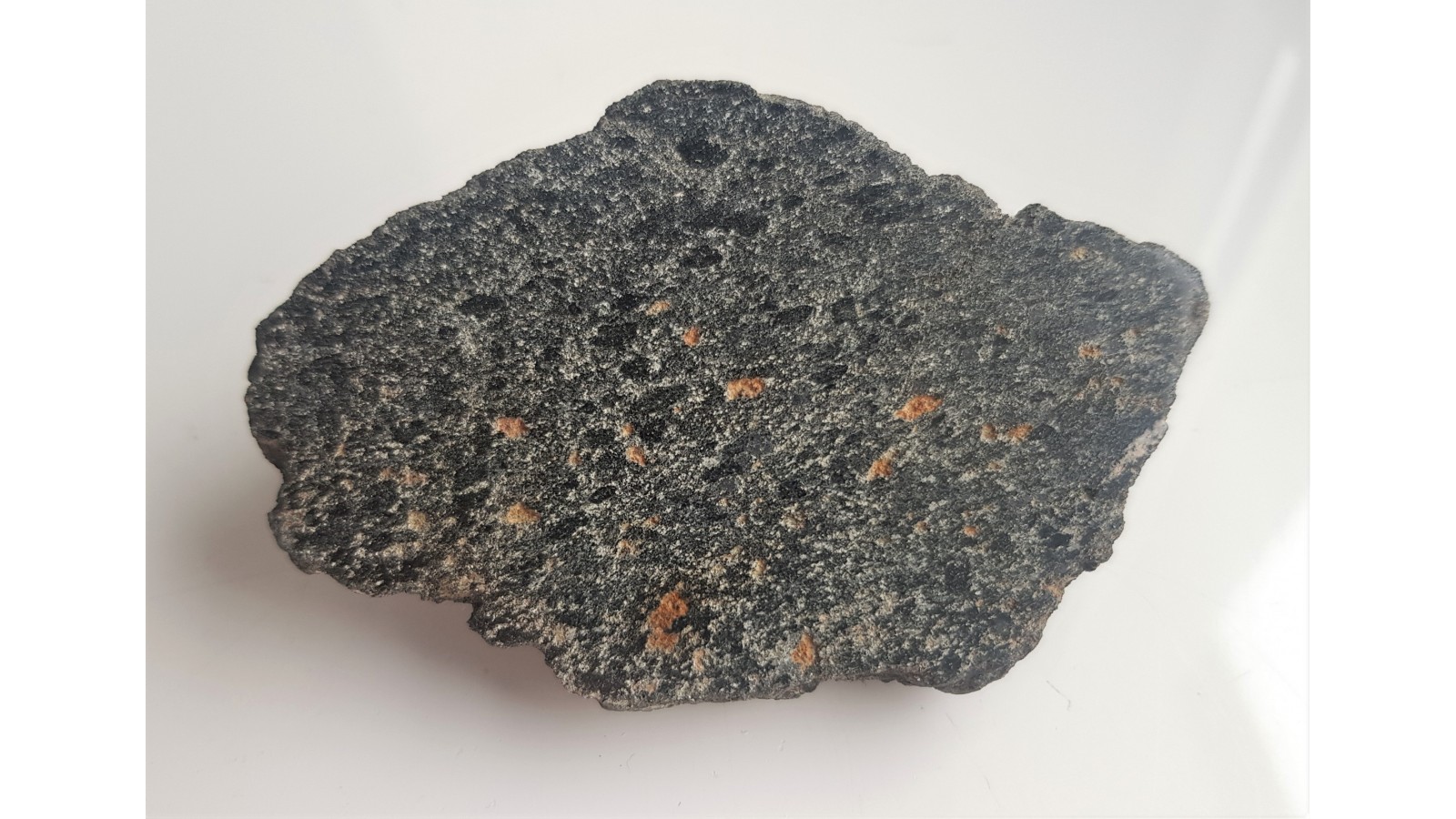 Polerowany okaz skały flogopitowo-apatytowej z Kopańca. Skałę wydobywano przy okazji poszukiwań rud uranu w obrębie leukogranitów. Tworzyła szlirę w leukogranitach oraz bezpośrednio łupkach amfibolowych. Apatyt w postaci drobnych, białych ziarenek pomiędzy blastami flogopitu. Ciekawostka petrologiczno-mineralogiczna Gór Izerskich. Strona przeciwna okazu natutalna, nie cięta.