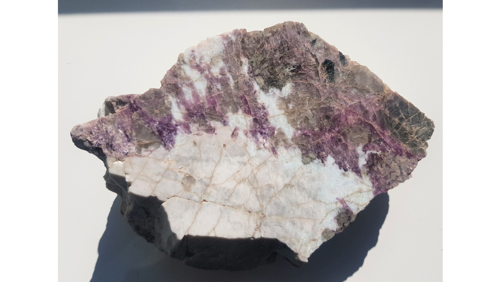 Polerowany okaz pegmatytu z czerwonymi turmalinami - elbaitem (turmalin litowy) oraz lepidolitem z Piławy Górnej w Górach Sowich. Piękny, barwny okaz. Doskonały poler. Strona przeciwna nie cięta, naturalna. Rzadkość mineralogiczna z dotychczas jedynego znanego w polskich Sudetach stanowiska turmalinów litowych.