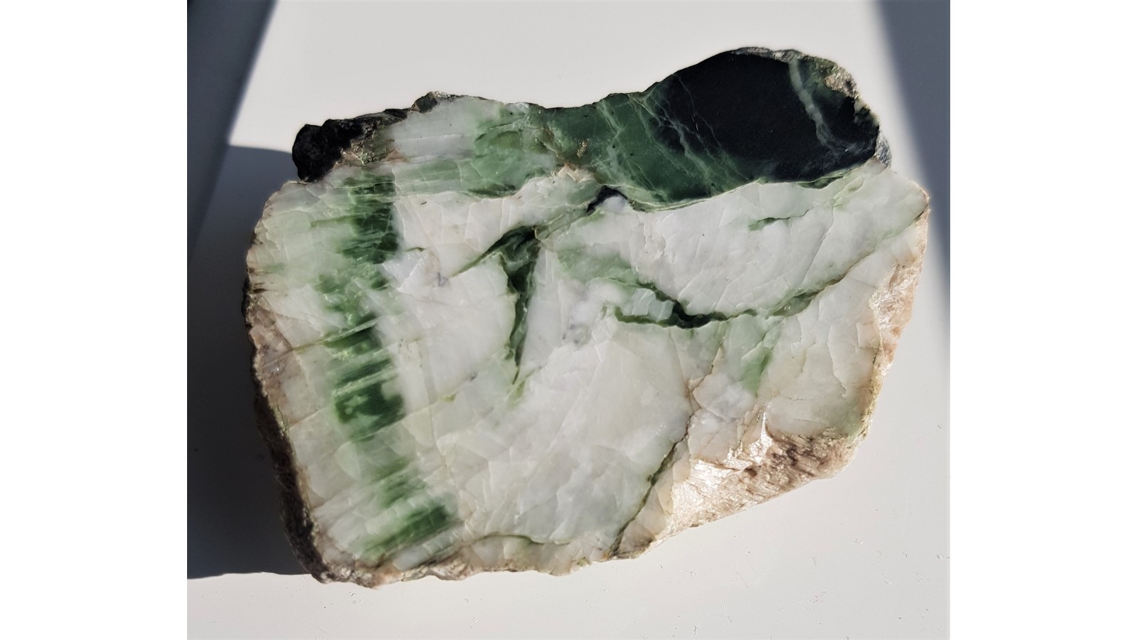 Polerowany okaz dolomitu w wrostkami intensywnie zielonego seropentynu z Nasławic. Strona przeciwna naturalna, nie cięta.