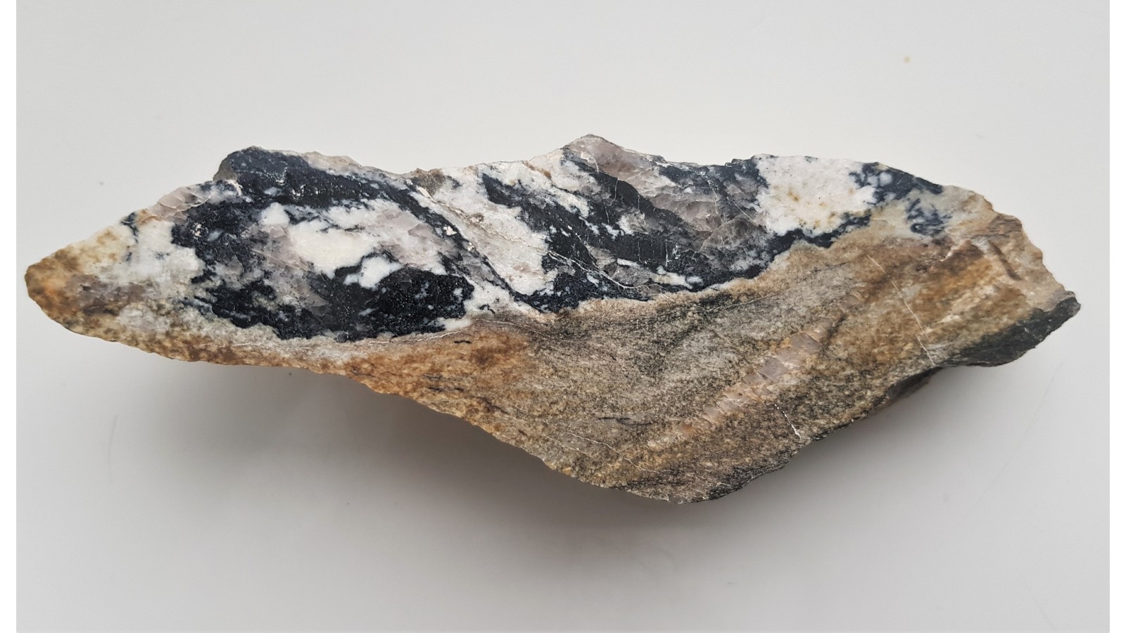Jasne, kwarcowo-skaleniowe wydzielenia z obfitym turmalinem w paragnejsie z Ciepłowodów. Paragnejsy są odmianą gnejsów powstałą ze skał osadowych. Okaz polerowany jednostronnie. Świetny poler. Strona przeciwna po cięciu.