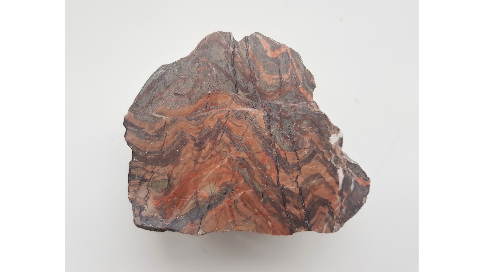Polerowany okaz wyraziście zafałdowanego, vczerwonego wapienia z Jarkowic w okolicy Kowar. Okaz polerowany jednostronnie, stronaprzeciwna naturalna, nie cięta.