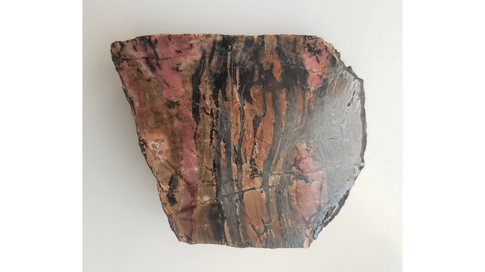 Pięknie wybarwiony, polerowany okaz rodonitu ze złoża Iacobeni w rumuńskich Karpatach. Złoże rud manganu wśród skał metamorficznych facji amfibolitowej nie jest już od dawna ekspoloatowane i ma historyczny charakter. Widoczna skała otaczająca, strona przeciwna naturalna, nie cięta. Piękny okaz, polecam.
