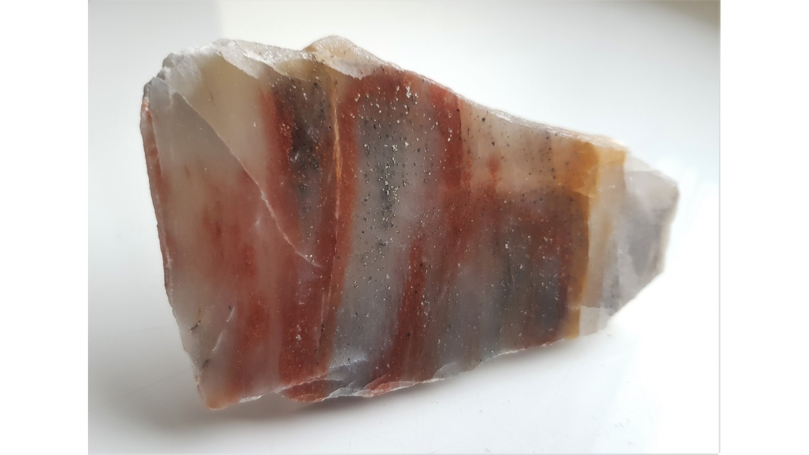 Płytka dekoracyjnego kwarcytu z widocznymi wrostkami pirytu z Jegłowej. Skała ozdobna, polerowana jednostronnie, przeświecająca, z pięknym deseniem. Strona przeciwna po cięciu.