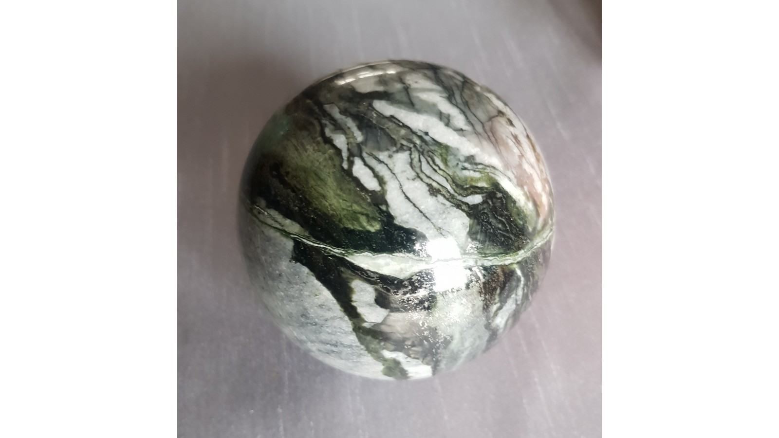 Kula o wspaniałym, kontrastowym deseniu wykonana z ozdobnej skały ze złoża arsenu i złota w Złotym Stoku. Kontrast jasnego dolomitu i kruszconośnych stref zbudowanych z minerałów rudnych oraz minerałów z grupy serpentynu. Widoczne "pęknięcie" de facto jest naturalną żyłką wypełnioną antygorytem. Niezwykle ozdobna, piękny poler.