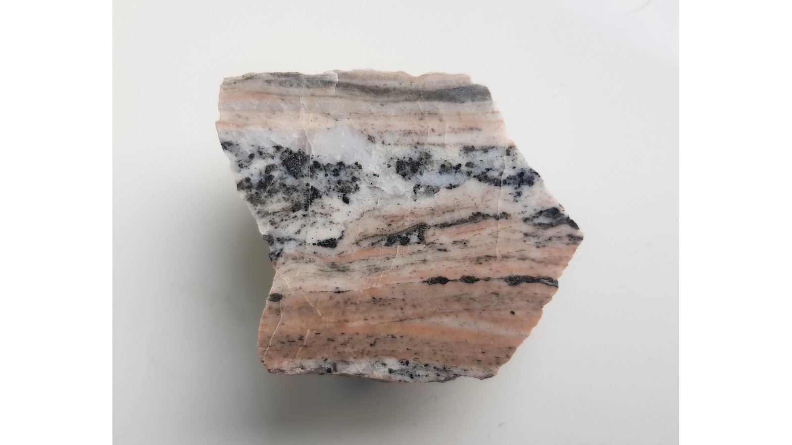 Polerowany okaz skały z wrostkami brązowych turmalinów ze złoża Budniki. Skała wykazuje wyraziste tekstury planarne. Turmalin bezpośrednio w kwarcu. Doskonały poler, strona tylna nie cięta, naturalna.