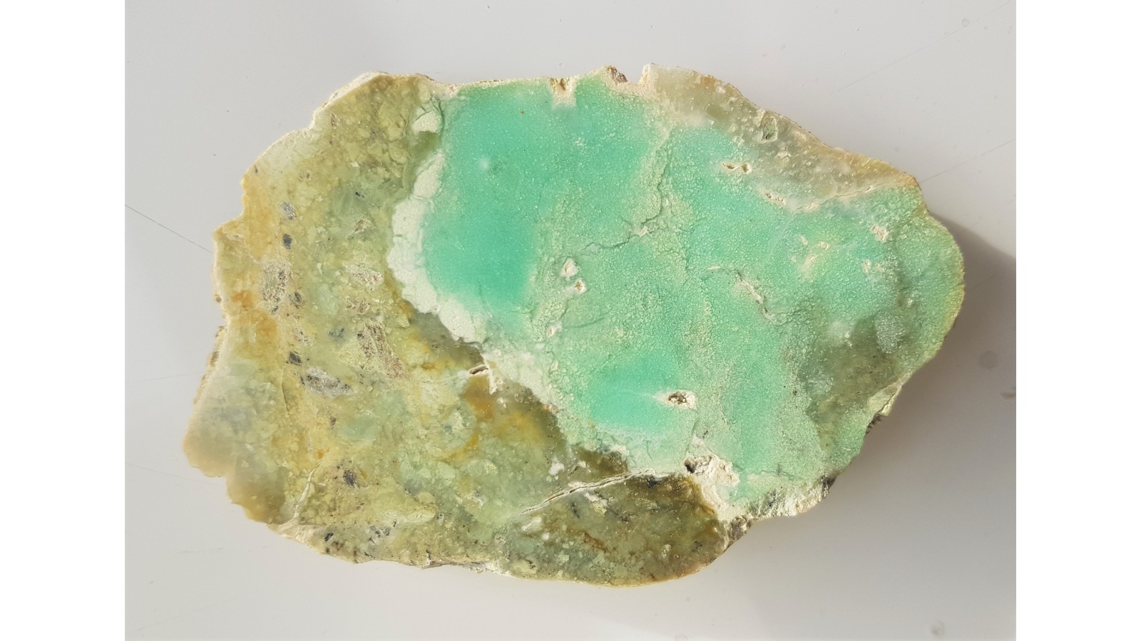Polerowany okaz chryzoprazu z Wir. Masywny chryzopraz w cienkiej, białej otulinie magnezytowo-pimelitowej, lity, bez spękań. Skontrastowany ze zwyczajnym chalcedonem. Strona przeciwna naturalna, nie cięta. Okaz z wyeksploatowanego już stanowiska mineralogicznego, duży, intensywnie i kontrastowo zabarwiony. Reprezentatywny okaz z nieczynnej kopalni magnezytu "Wiry" w Wirkach. Polecam.