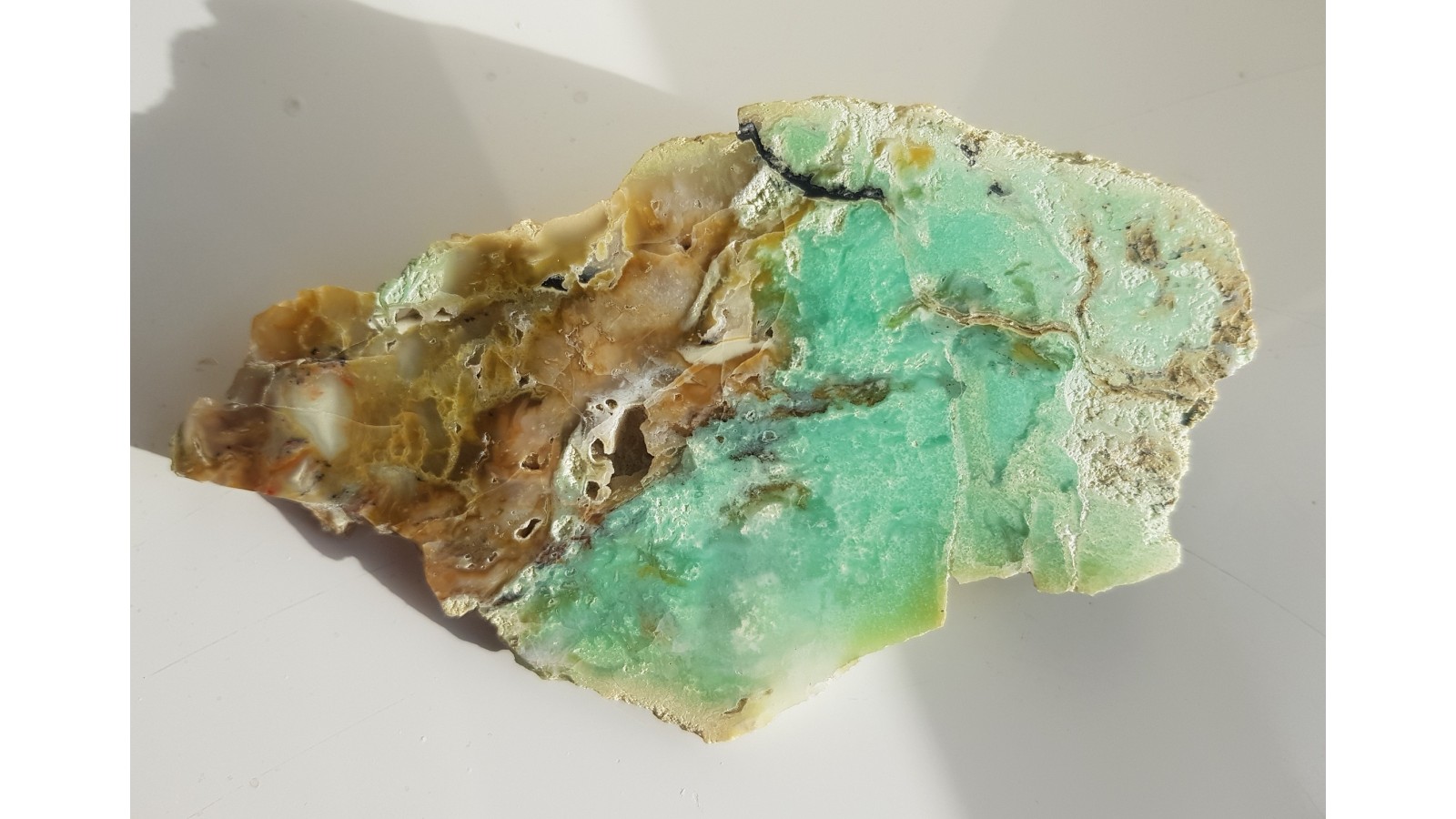Chryzopraz z Wirów k. Sobótki w Masywie Ślęży. Okaz polerowany, ładny kontrast ze skałami chalcedonowymi w odcieniach brązu. Strona przeciwna naturalnia, nie cięta. Unikatowa lokalizacja, rzadko występujące na rynku okazy. Polecam do kolekcji regionalnej.
