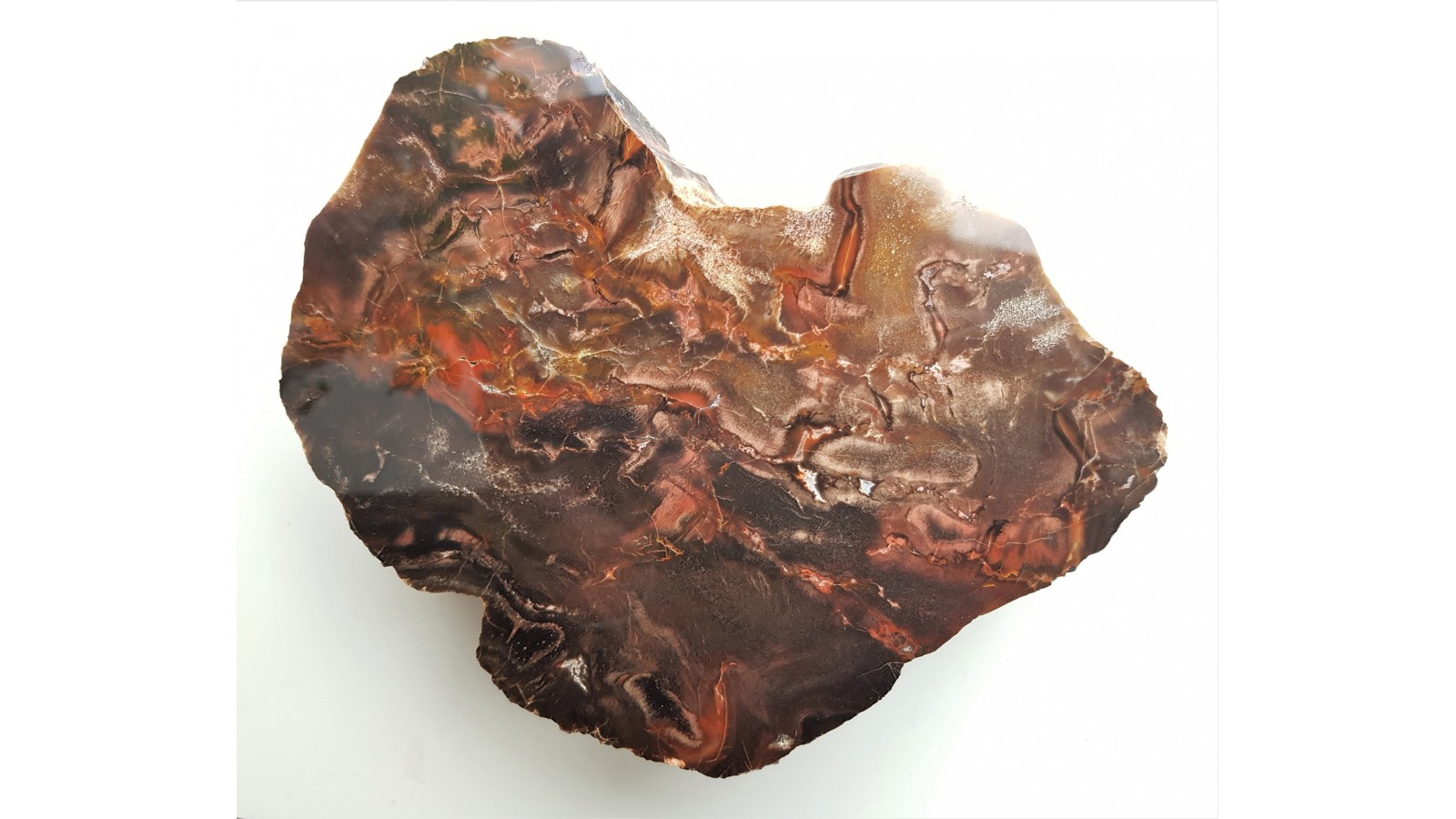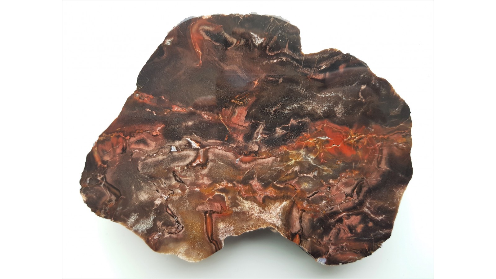 Duże, polerowane, niespękane drewno skrzemieniałe z aluwiów Nysy Kłodzkiej z okolic Kamieńca Ząbkowickiego. Piękne barwy i deseń. Poler jednostronny, strona przeciwna naturalna, nie cięta. Bardzo estetyczny okaz.