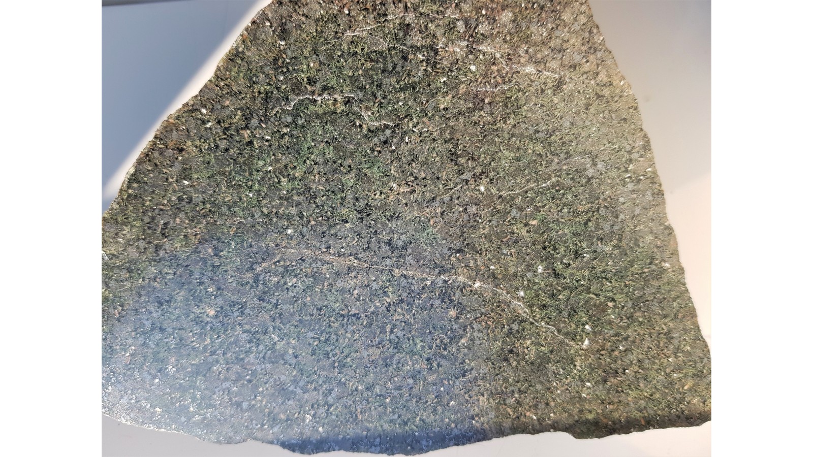 Okaz polerowanego jednostronnie dolerytu, w którym stwierdzono czysty jadeit. Jadeit w formie zielonych skupień na brzegach kryształów albitu (jasne tabliczki). Wszystkie minerały - zmieniony albit, pierwotne piroskeny, minerały nieprzejrzyste widoczne na zgładzie nawet bez szkła powiększającego. Doleryty tego rodzaju zostały opisane z chaotycznej struktury geologicznej z okolic Jędrzychowic k. Zgorzelca interpretowanej jako olistostroma. Pochodziły z erodowanego masywu metamorficznego ze skałami facji łupków niebieskich.