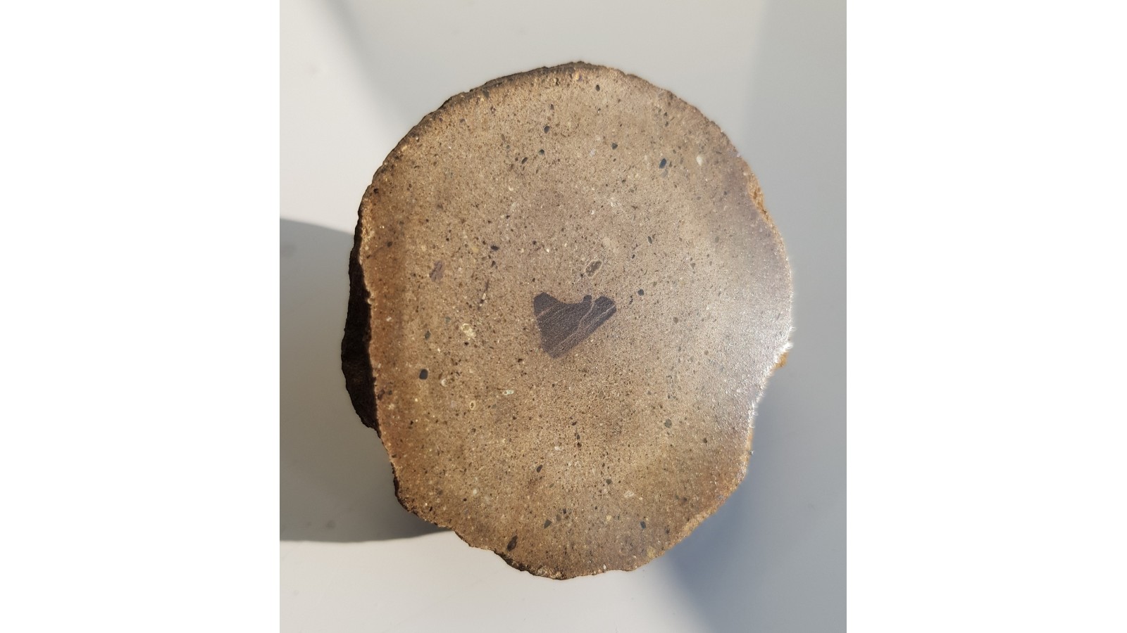 Ciekawa z uwagi na wyrazistą formę konkrecja z szarogłazu z Młynowa k. Kłodzka, w środku której widoczny jest klast skały metamorficznej. Okaz polerowany. Strona przeciwna naturalna - nieuszkodzona, obła powierzchnia konkrecji.