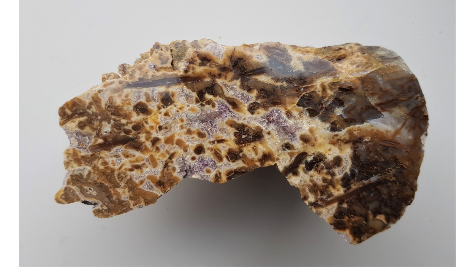 Chalcedon z wyrazistymi pseudostalaktytami oraz partiami z krystalicznym ametystem z aluwiów Nysy Kłodzkiej z okolic Kamieńca Ząbkowickiego. Piękny deseń, kontrastowy okaz. Okaz polerowany jednostronnie. Strona przeciwna naturalna, nie cięta.