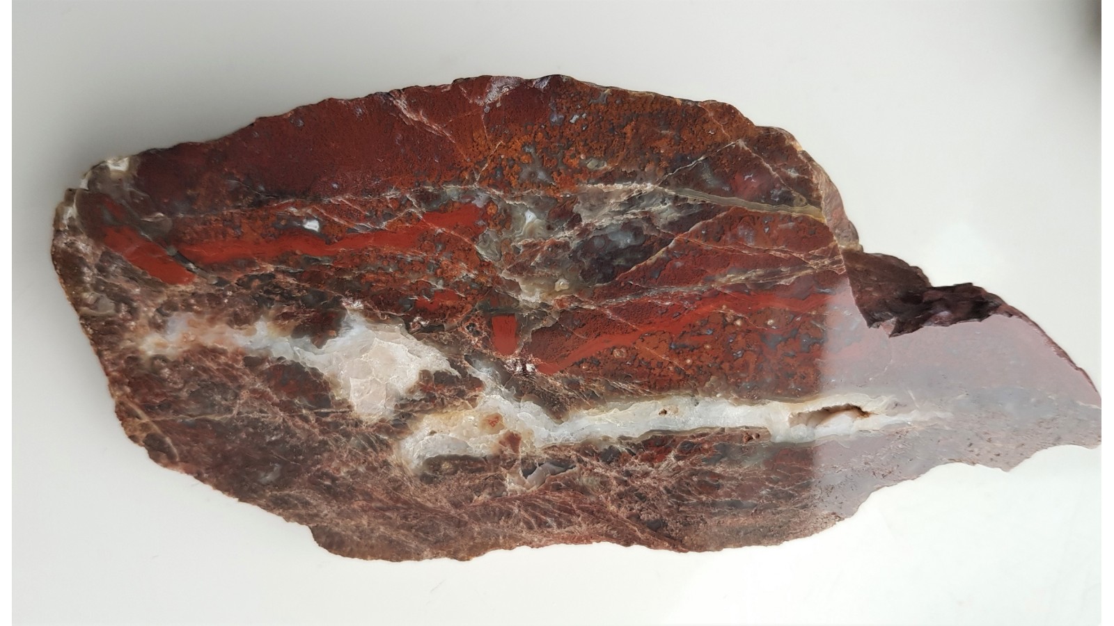 Jaspis z aluwiów Nysy Kłodzkiej z okolic Kamieńca Ząbkowickiego. Wyrazista barwa. Okaz polerowany jednostronnie. Strona przeciwna naturalna, nie cięta.