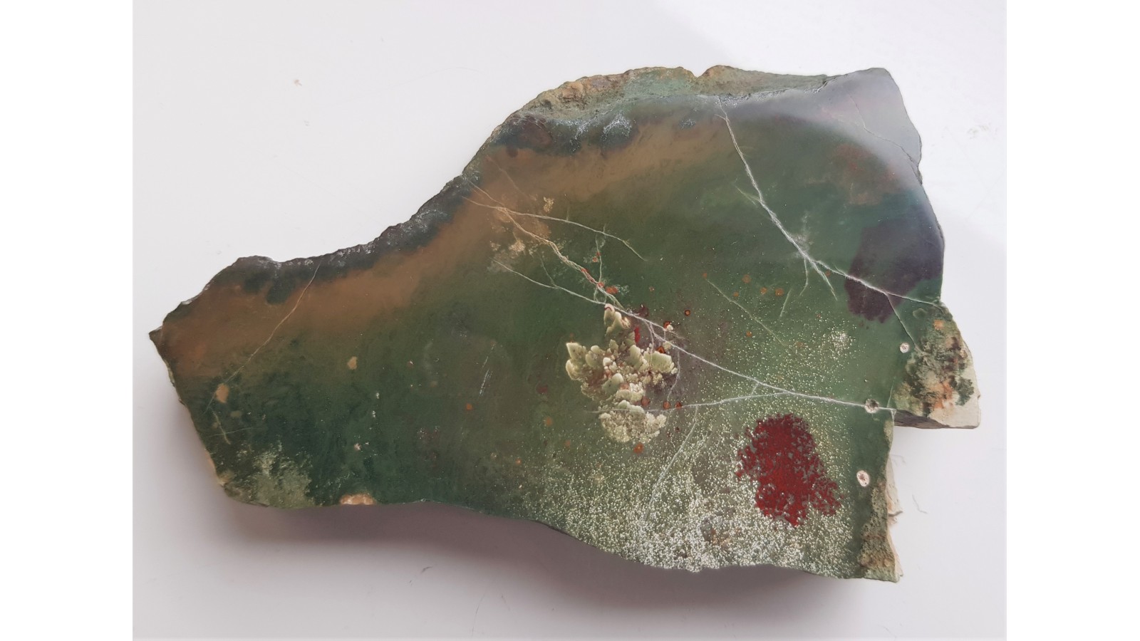 Polerowany okaz heliotropu (zielony chalcedon nakrapiany czerwono) z okolic Sokołowska w Górach Suchych. Czerwona duża plama złożona z małych czerwonych punktów. Również drobniejsze cętki czy smugi barwy czerwonej. Rzadkość w polskich Sudetach. Strona przeciwna po cięciu.