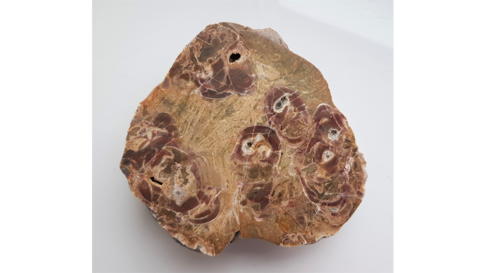 Okaz unikatlowej skały - ryolitu orbikularnego z aluwiów Nysy Kłodzkiej z okolic Kamieńca Ząbkowickiego. Widoczne zarówno na stronie przeciwnej jak i na zgładzie owalne twory wypełnione częściowo chalcedonem o budowie koncentrycznej. Piękny poler, duży, spektakularny okaz.