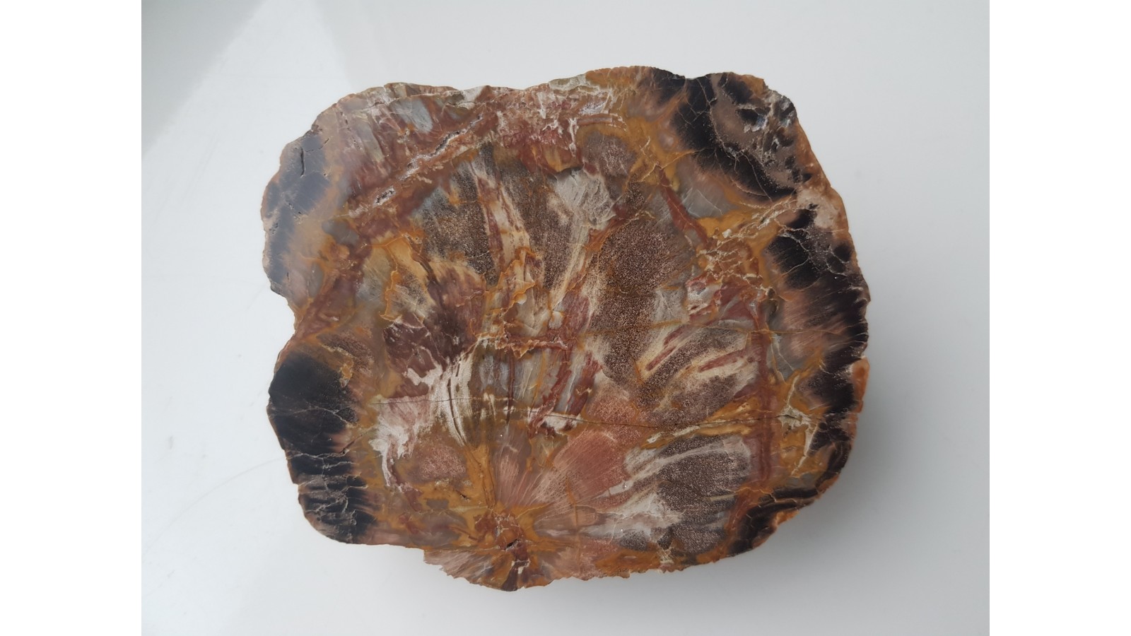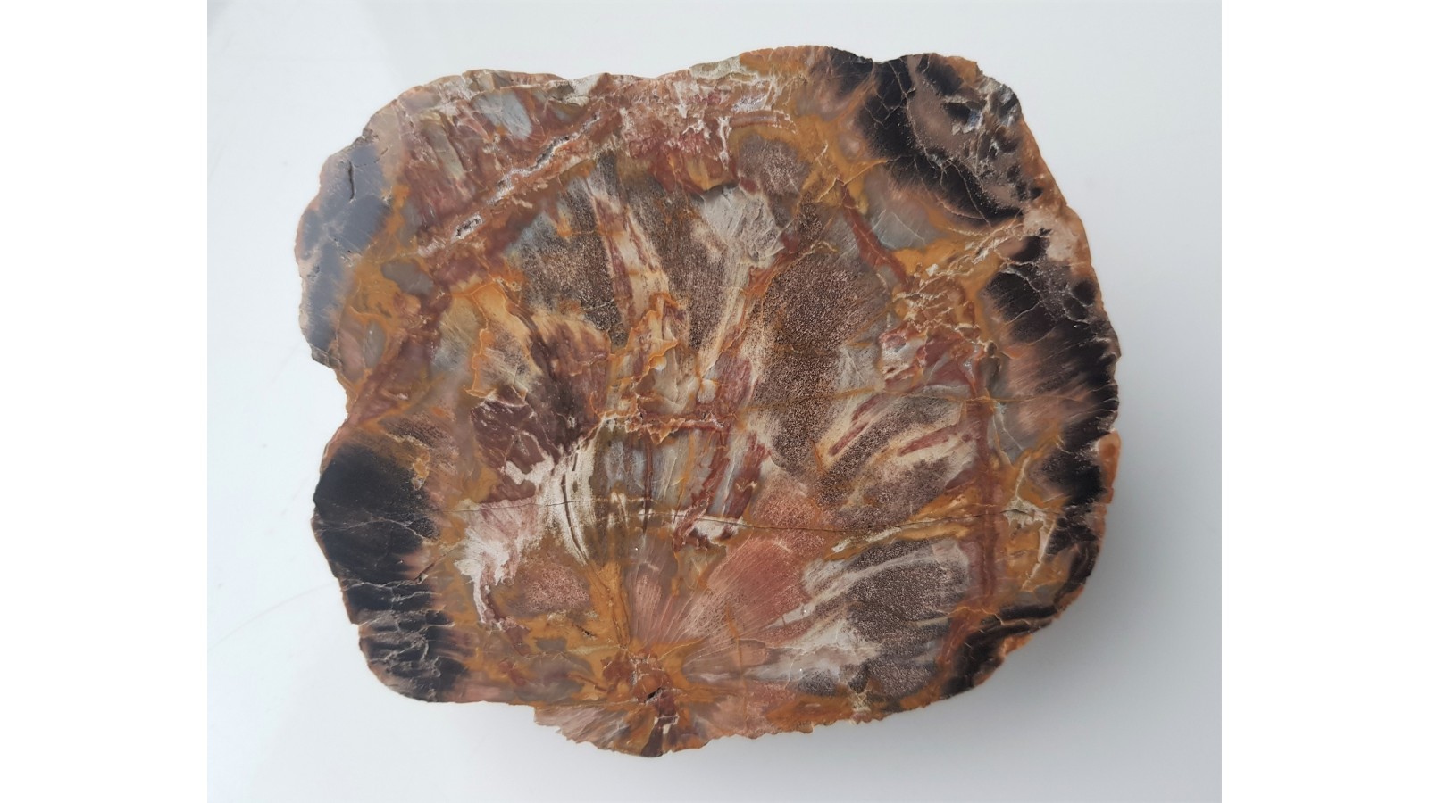 Wyjątkowe drewno skrzemieniałe z widocznym centrum pnia. Niezwykle barwne. Okaz z aluwiów Nysy Kłodzkiej z okolic Kamieńca Ząbkowickiego. Strona przeciwna naturalna, nie cięta. Wyjątkowy okaz. Polecam.