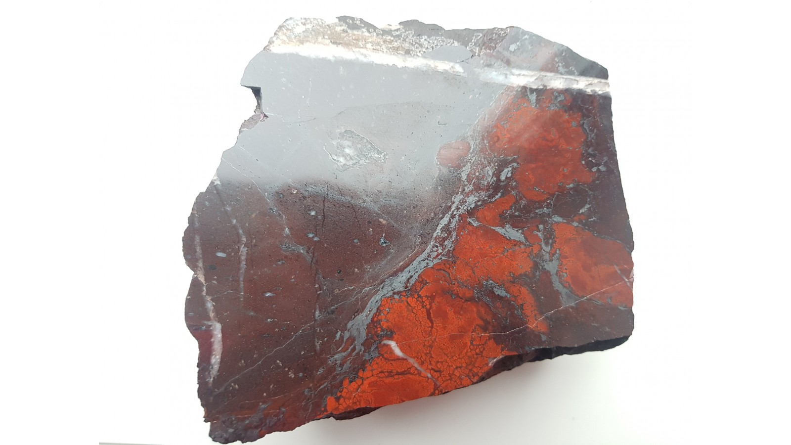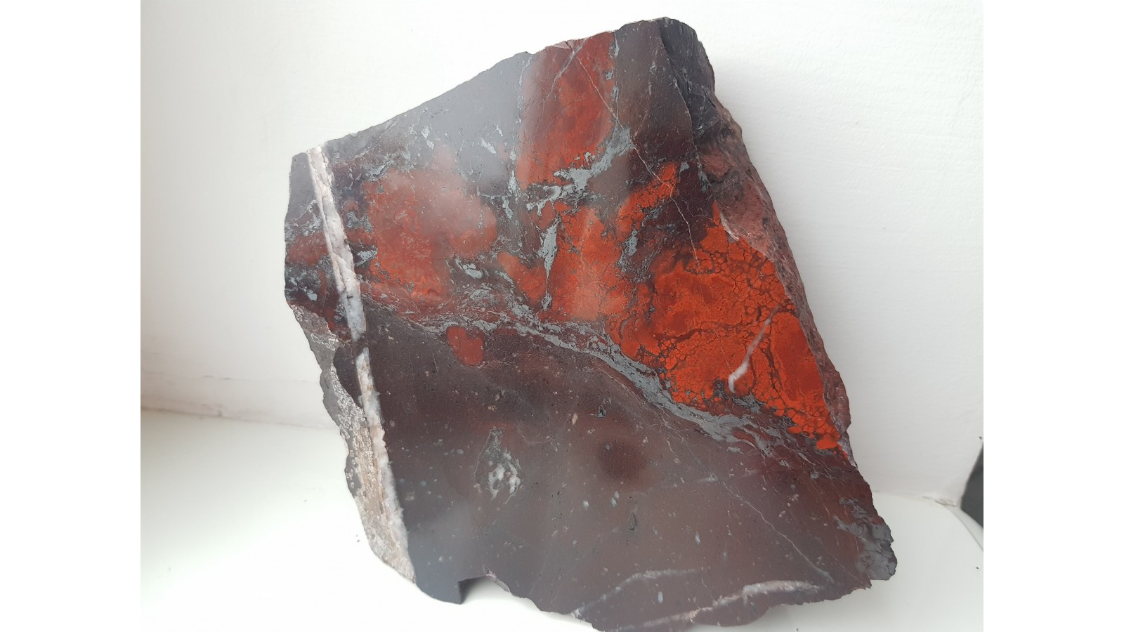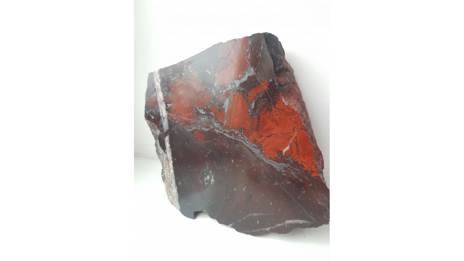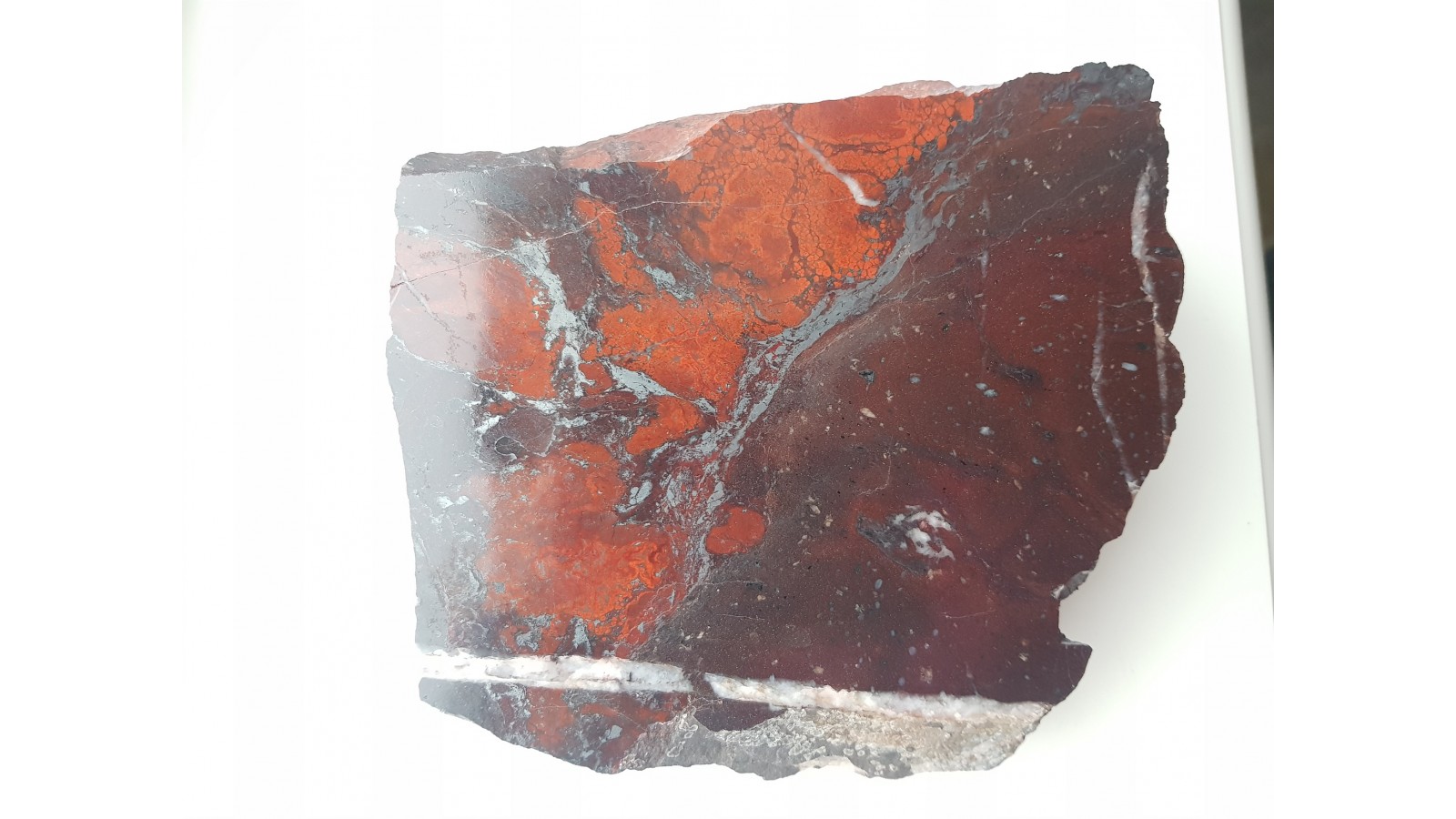 Piękny okaz tzw. jaspisu koralowego (krwistoczerwone, owalne wydzielenia jaspisu w jego ciemniejszej, brunatnej odmianie) ze zlepieńców kulmu niecki śródsudeckiej okolic Kamiennej Góry. Piękny poler, strona przeciwna naturalna, nie cięta. Okaz kontrastowy, pięknie czerwony, duży i niespękany.