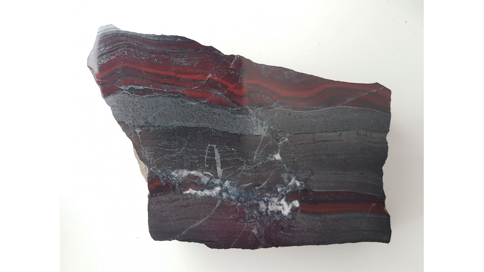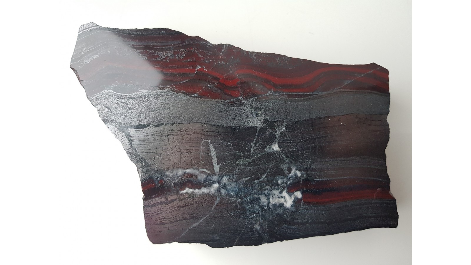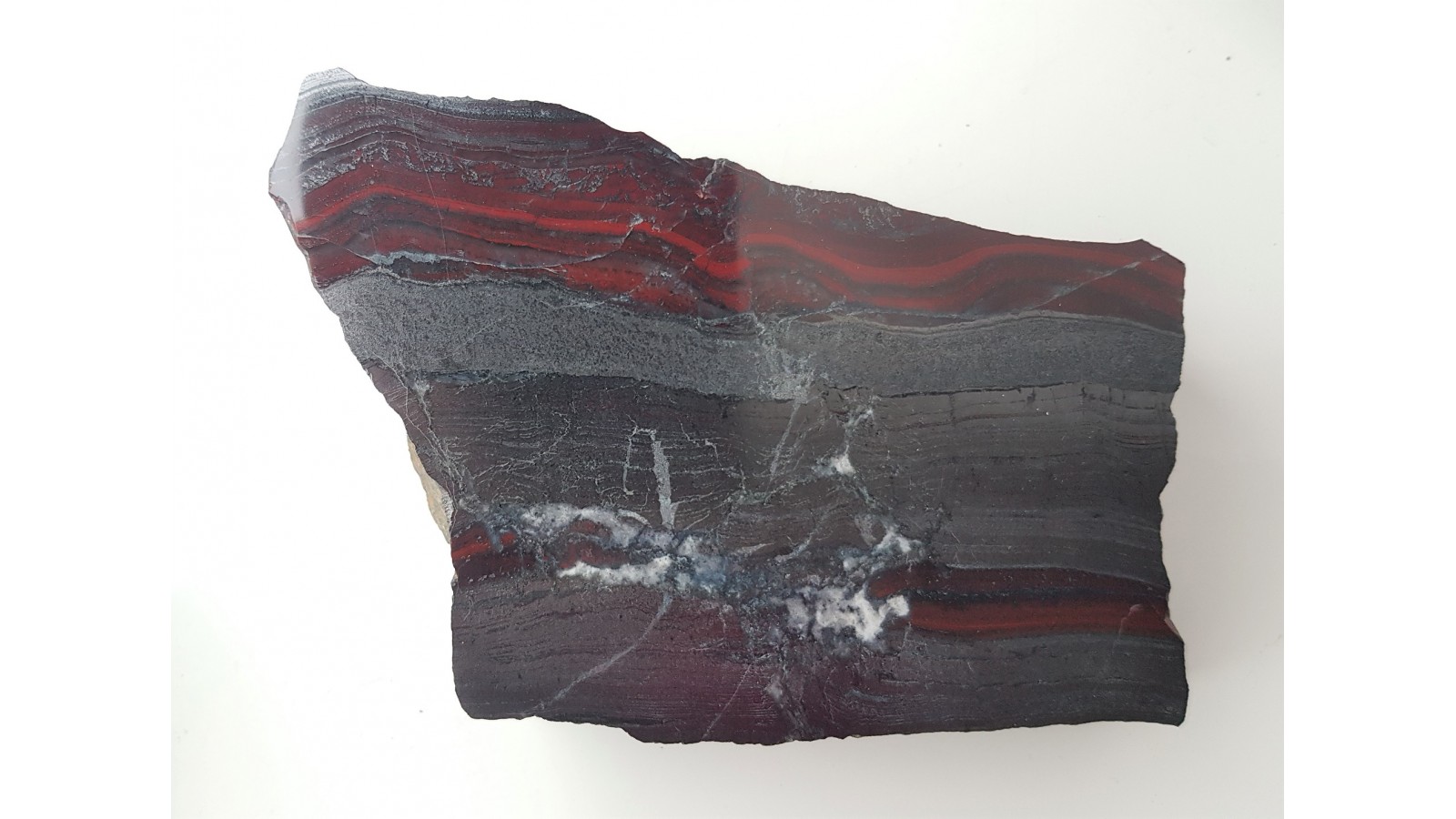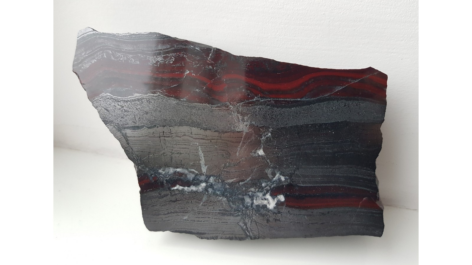 Polerowana jednostronnie płyta jaspilitu (BIF) z Ukrainy. BIF-y mają ok. 2,5 mld lat i pochodzą z okresu tzw. akrecji kontynentów i kiedy tlen był niemal zupełnie zużywany na utleniane żelaza w zbiornikach morskich (czerwniona barwa jaspilitów z powodu obecności hematytu a także goethytu, martytu). Polecam do kolekcji petrologiczno-geologicznej. Piękny, duży okaz z widocznymi wrostkami niebieskiegoi magnesioriebeckitu, co podnosi atrakcyjność okazu. Polecam.