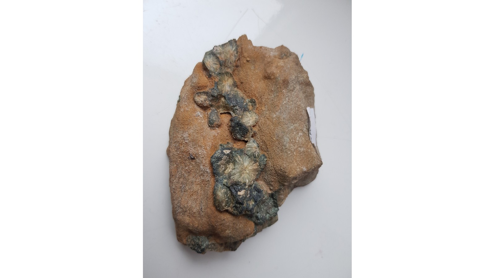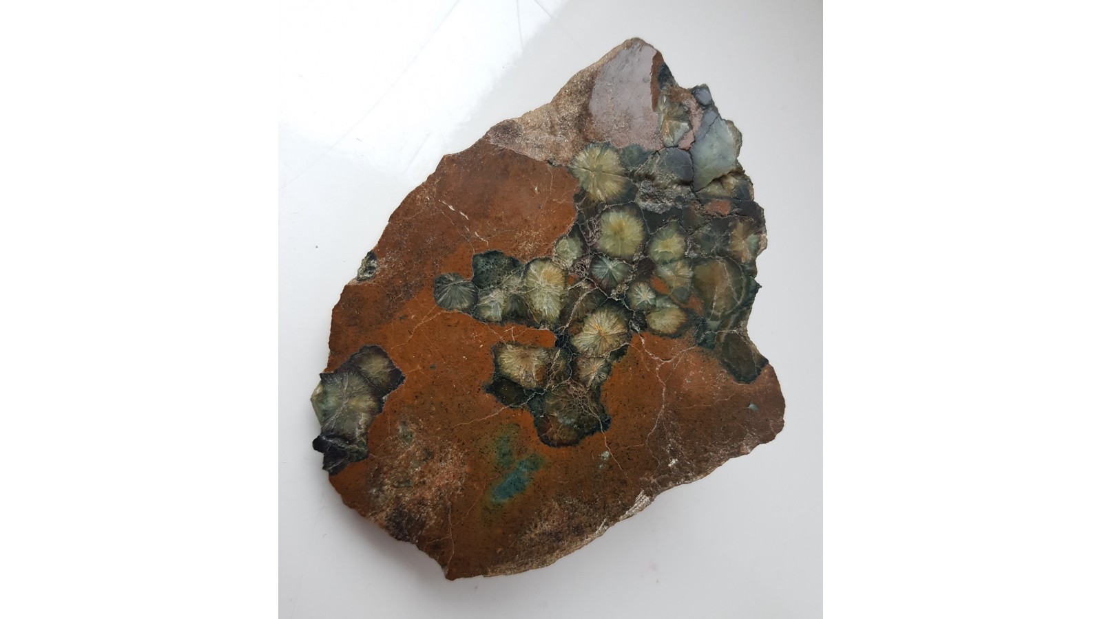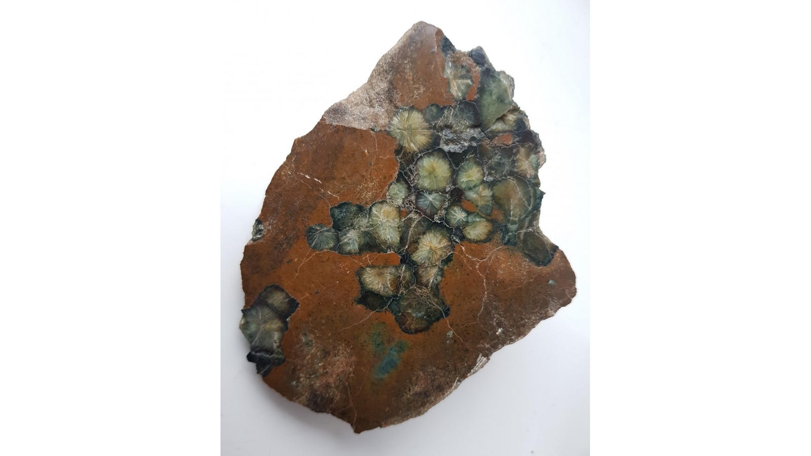 Wyjątkowy okaz kwarcu gwiaździstego z Dobesovic w Czechach. Okaz polerowany jednostronnie. Widoczne zielone skupienia kwarcu gwiaździstego na tle rudawej skały. Wyjątkowa estetyka okazu. Na stronie przeciwnej wypreparowane naturalnie, wskutek wietrzenia, gwiazdki kwarcu. Rzadko spotykane okazy. Polecam.