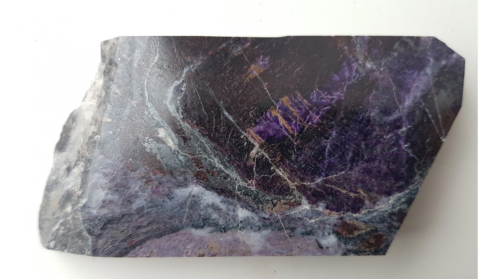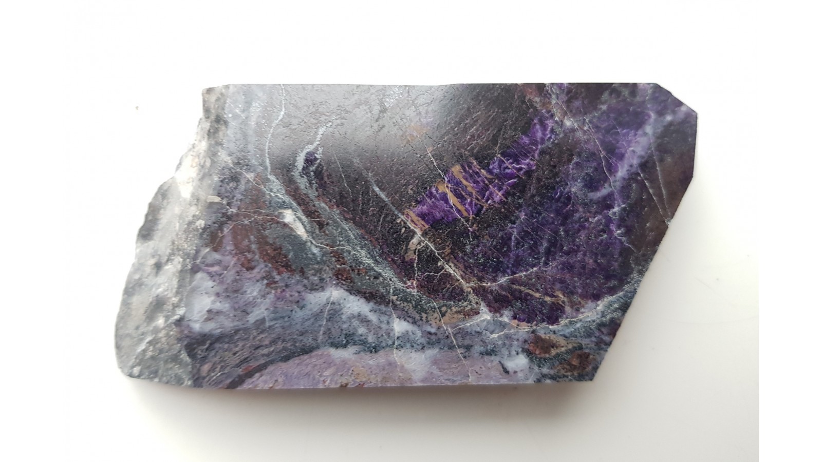 Wyjątkowy dzieki rzadkości występowania i urodzie nie ustępującej czaroitowi - violan - manganowy diopsyd z Włoch. Materiał trudno dostępny. Piękny poler od strony ekspozycyjnej.