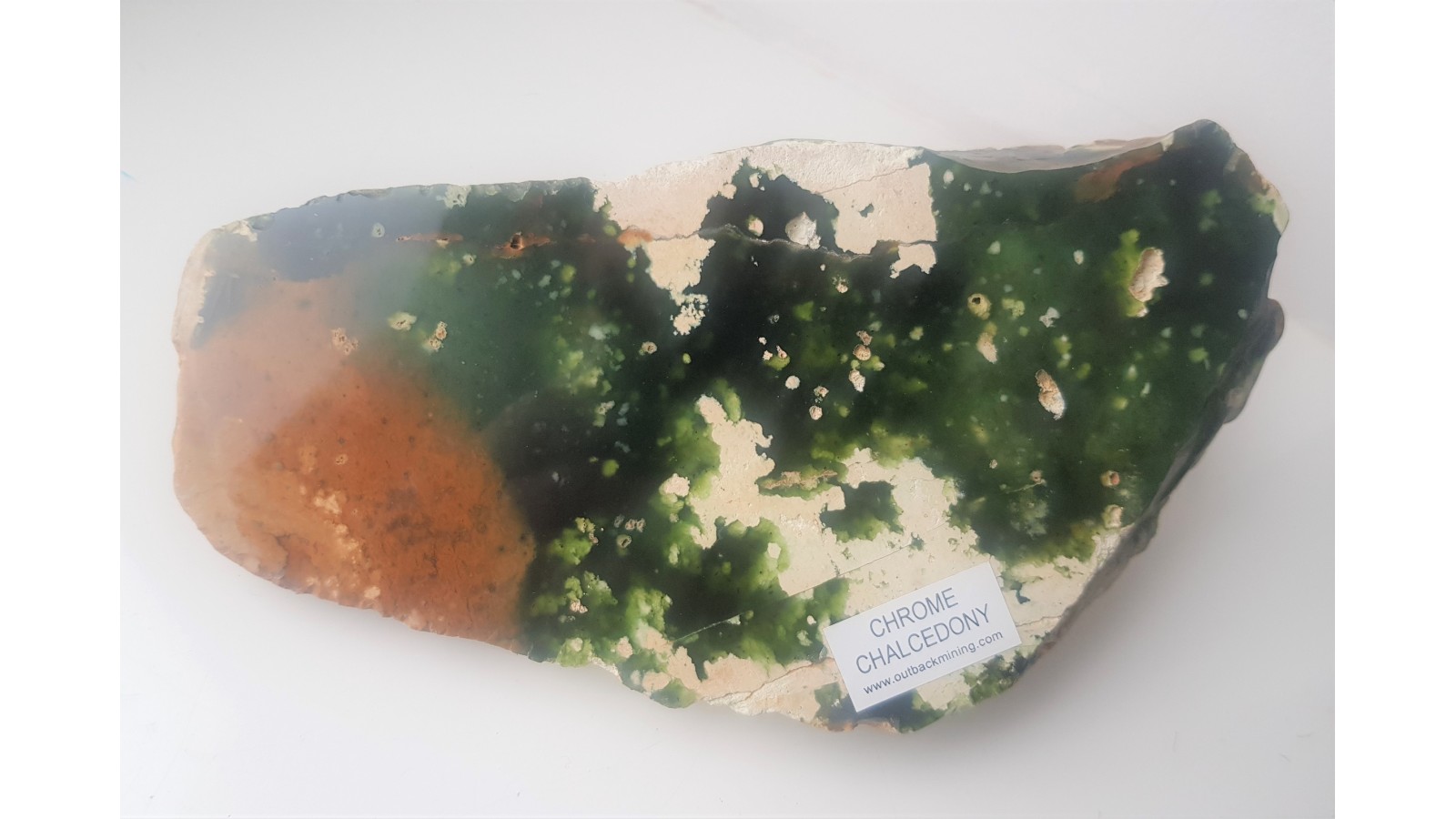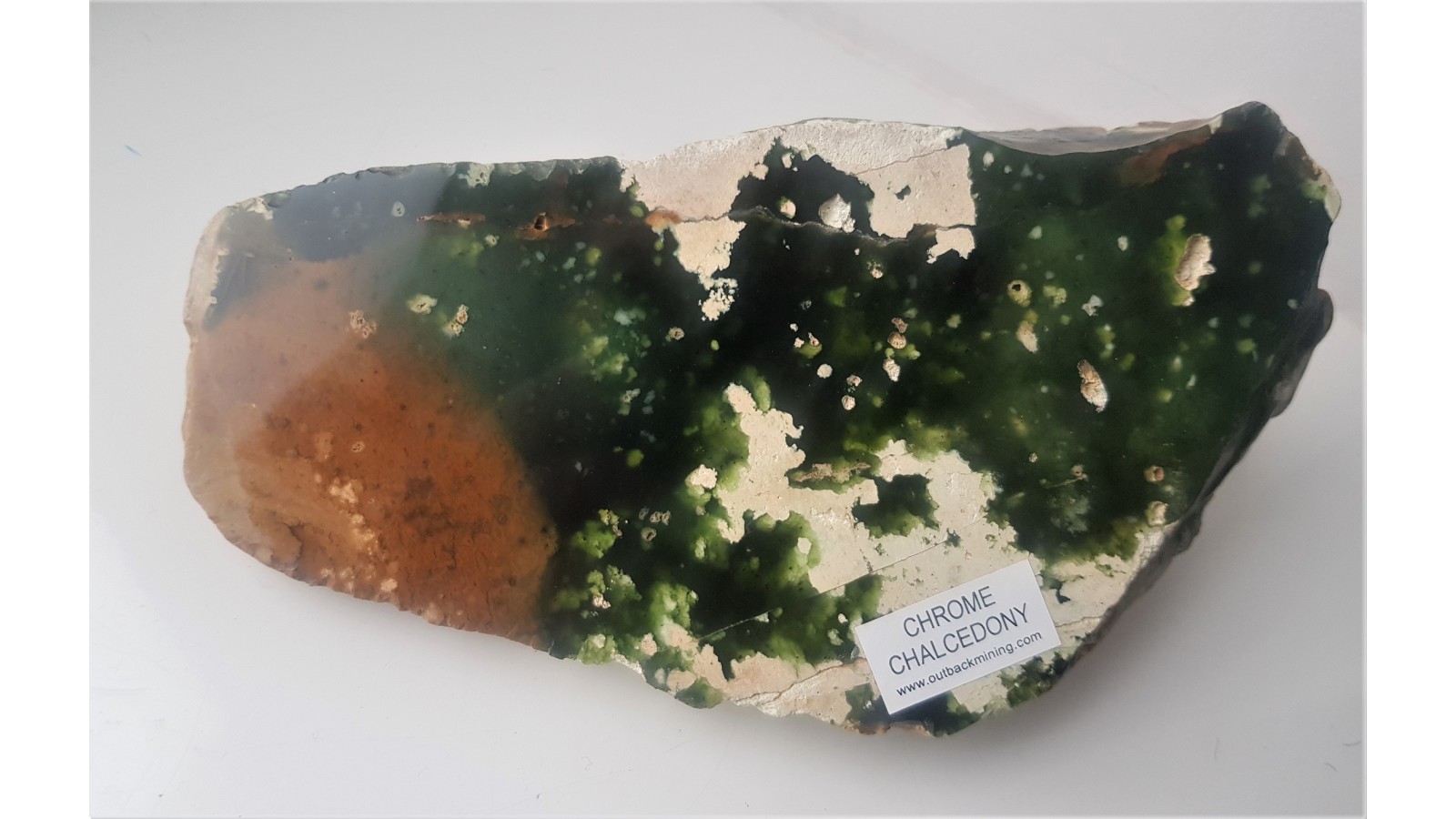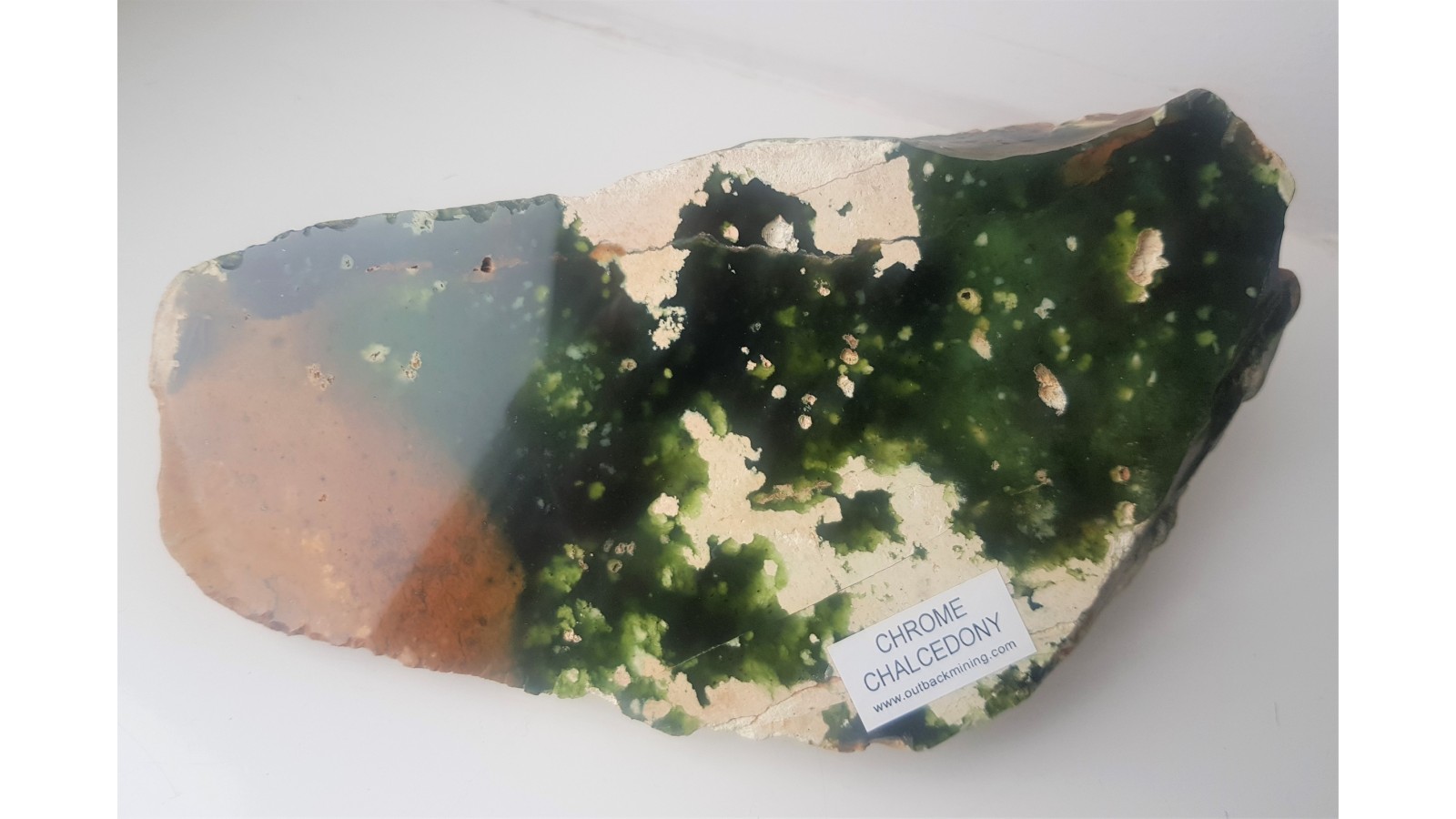 Wyjątkowej klasy z uwagi na wielkość, głęboki kolor, przezroczystość oraz brak spękań okaz chalcedonu chromowego z zachodniej Australii z rejonu Pilbary. Chalcedony chromowe występują tam w zmienionych serpentynitach. Okaz polerowny jednostronnie, wyjątkowej urody. Polecam.