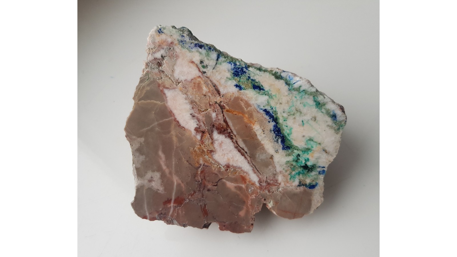 Polerowany okaz różanki świętokrzyskiej z Miedzianki k. Kielc pięknie zmineralizowany malachitem i azurytem. Spory, bardzo estetyczny okaz o wyrazistej teksturze. Różanka jest zespoloną kalcytem brekcją tektoniczną z charakterystycznym deseniem nadanym przez dewońskie wapienie jak i późniejszą mineralizację. Strona przeciwna naturalna, nie cięta.