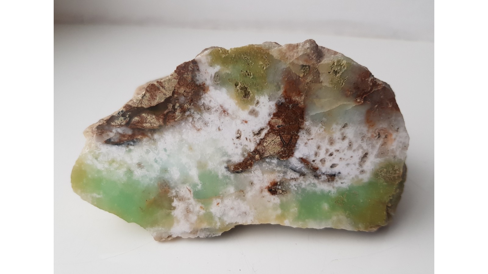Niezwykły okaz - chryzopraz z pięknym kontrastem barw - intensywnej zieleni i śnieżnej bieli a także niezwykłym deseniem. Absolutnie wyjątkowy, do kolekcji.