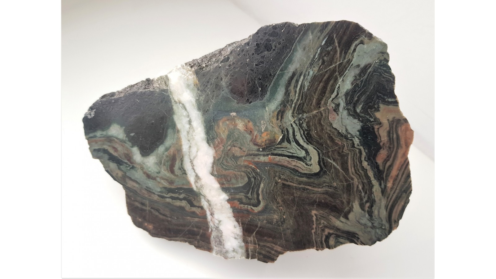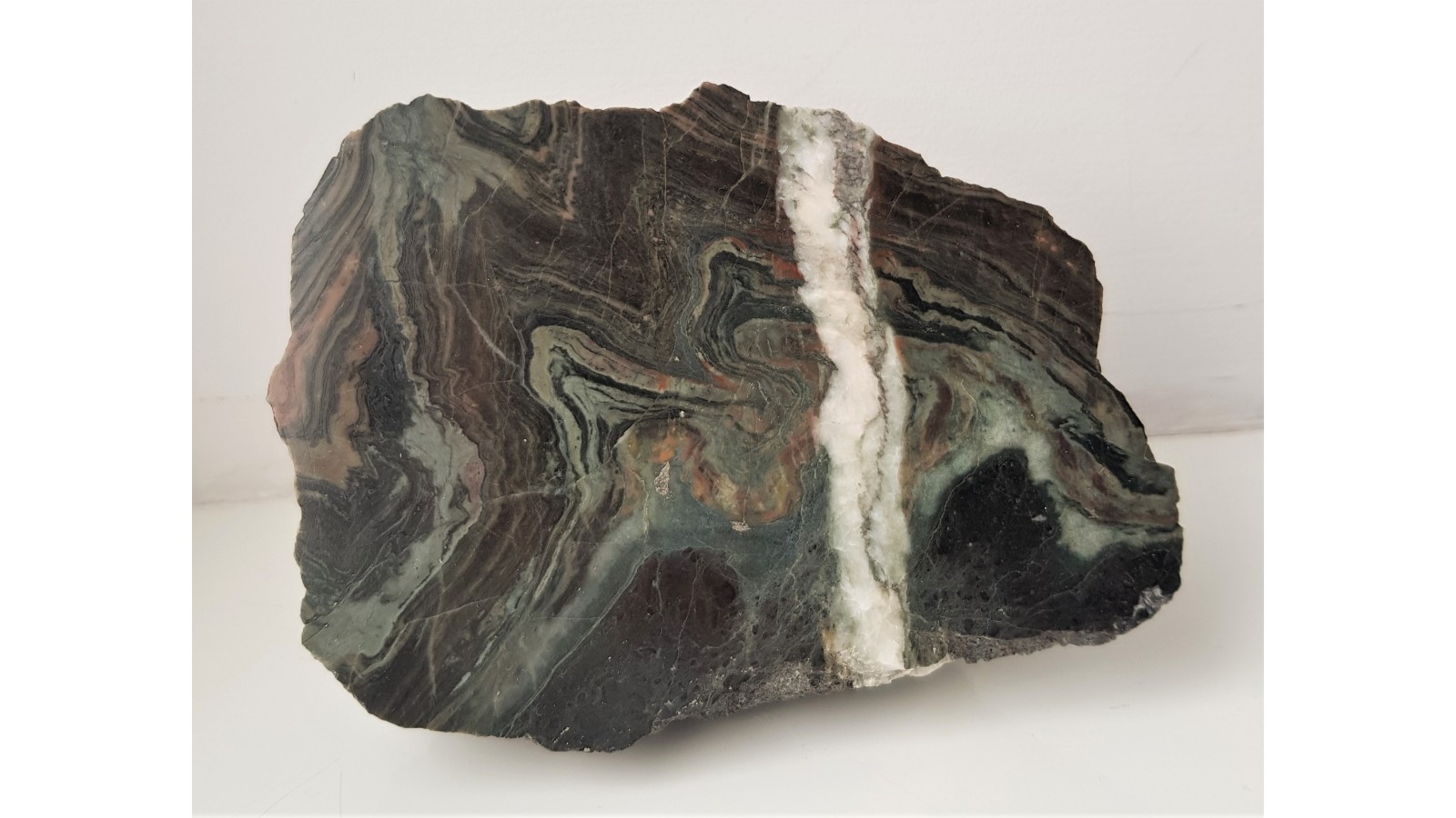 Wyjątkowy okaz zafałdowanego skarnu o pięknym, kontrastowym zabarwieniu i bardzo wyrazistym deseniu. Niezwykle ozdobny okaz z Kowar. Polecam.