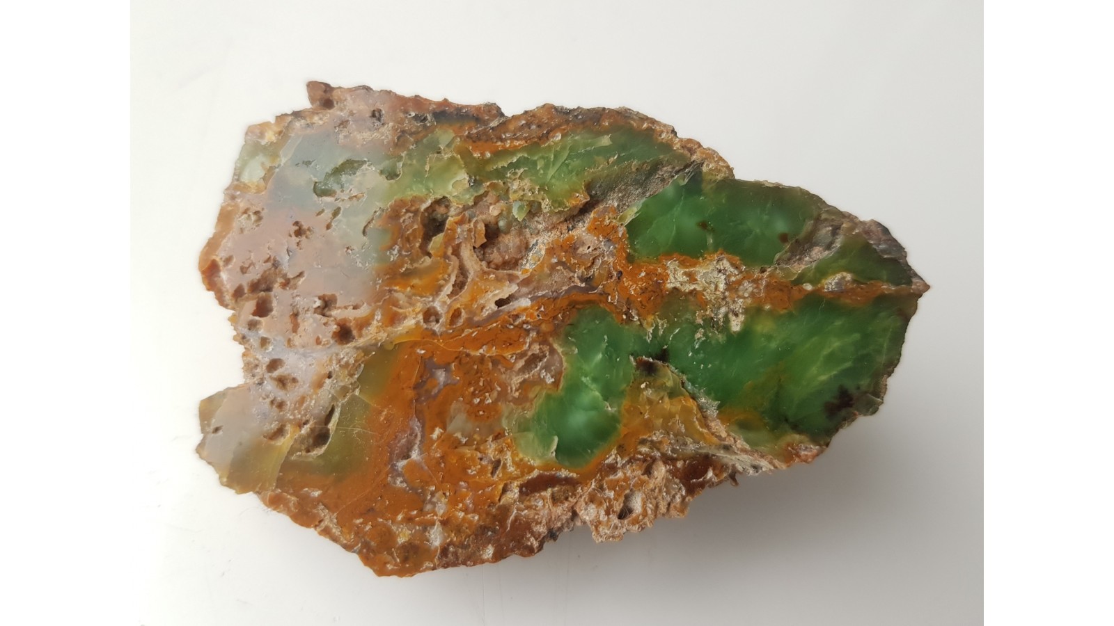 Polerowany okaz chryzoprazu z trzeciej znanej w Sudetach lokalizacji - Grochowej. Intensywna, nasycona barwa. Doskonały poler. Okazy z Grochowej należą do grupy rzadkich pozycji kolekcjonarskich.