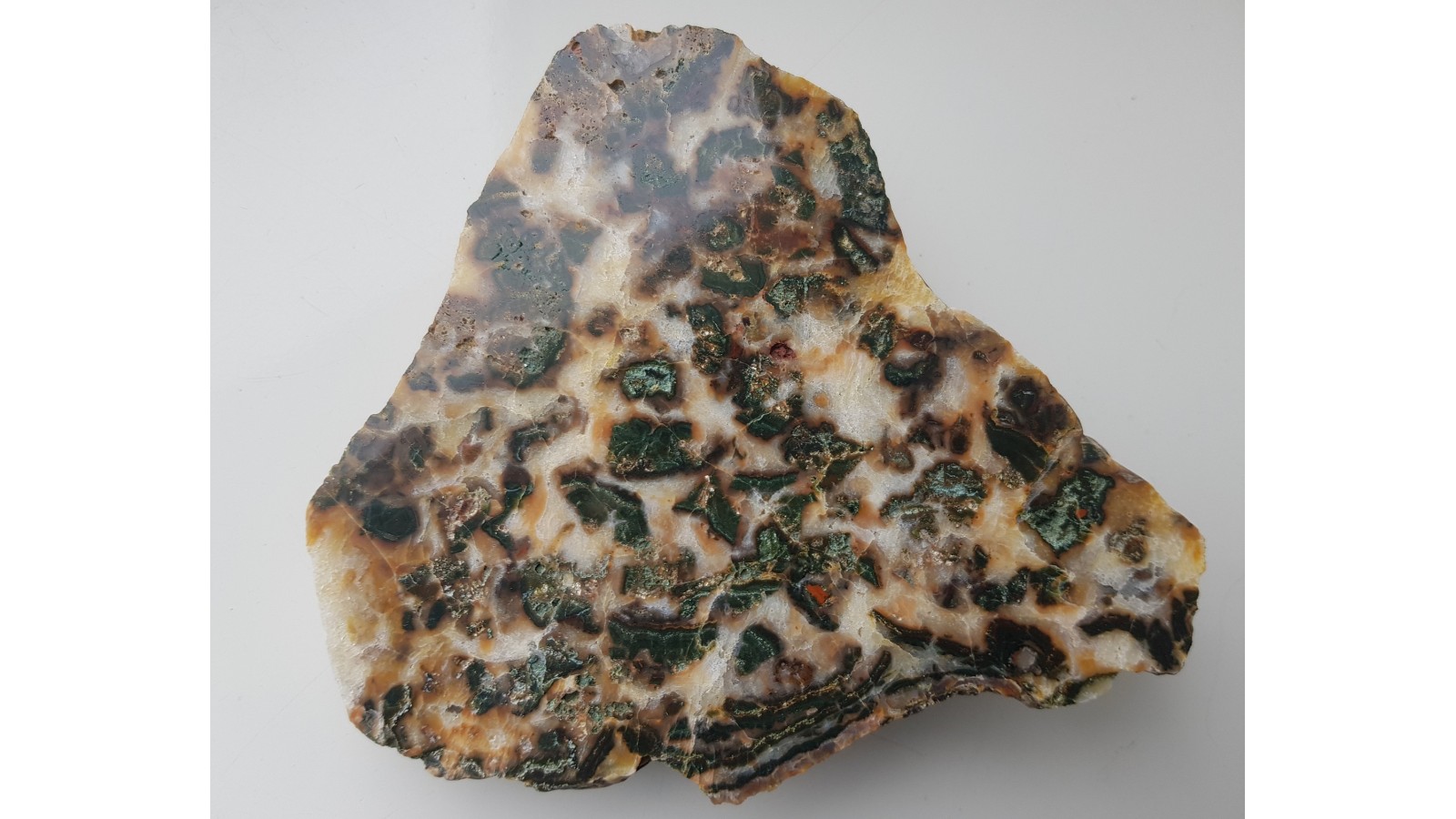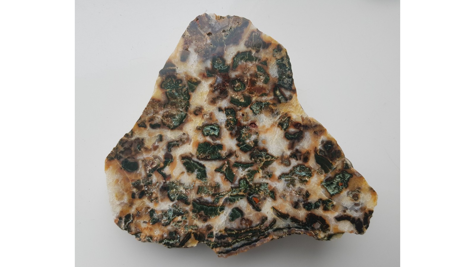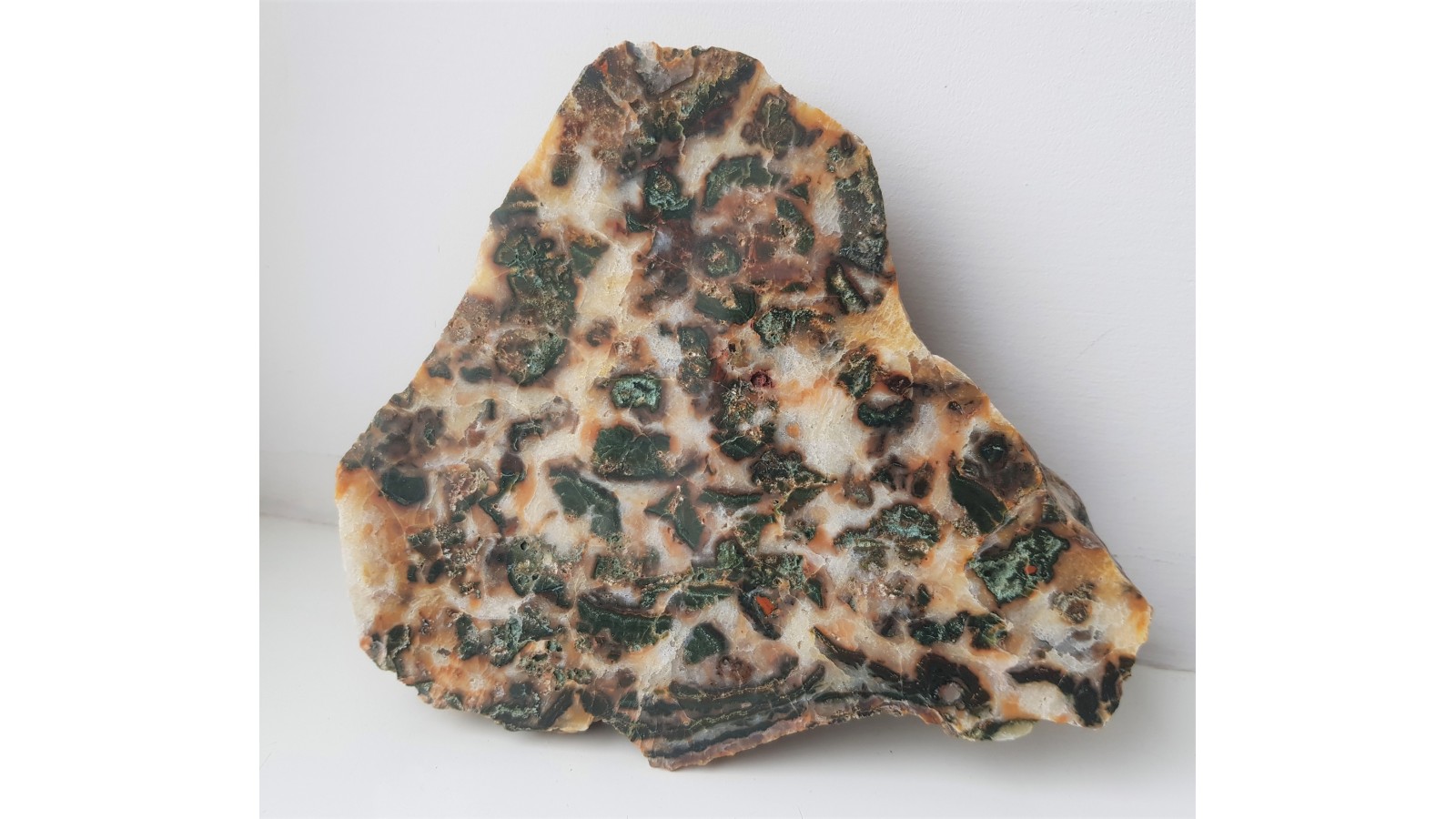 Duży, polerowany okaz niezwykłej konkrecji chalcedonowej, w której fragmenty intensywnie zielonej skały krzemionkowej są zatopione w białym bądź jasnożółtym chalcedonie i kwarcu. Wyjątkowy i piękny okaz z aluwiów Nysy Kłodzkiej z okolic Kamieńca Ząbkowickiego. Polerowana jednostronnie, strona przeciwna to naturalna powierzchnia otoczaka.