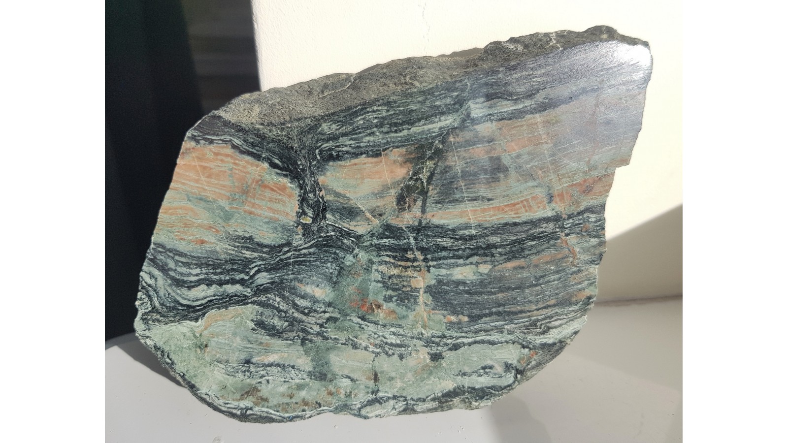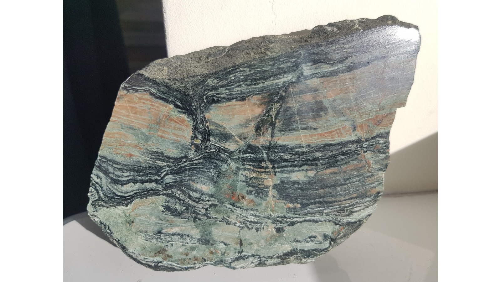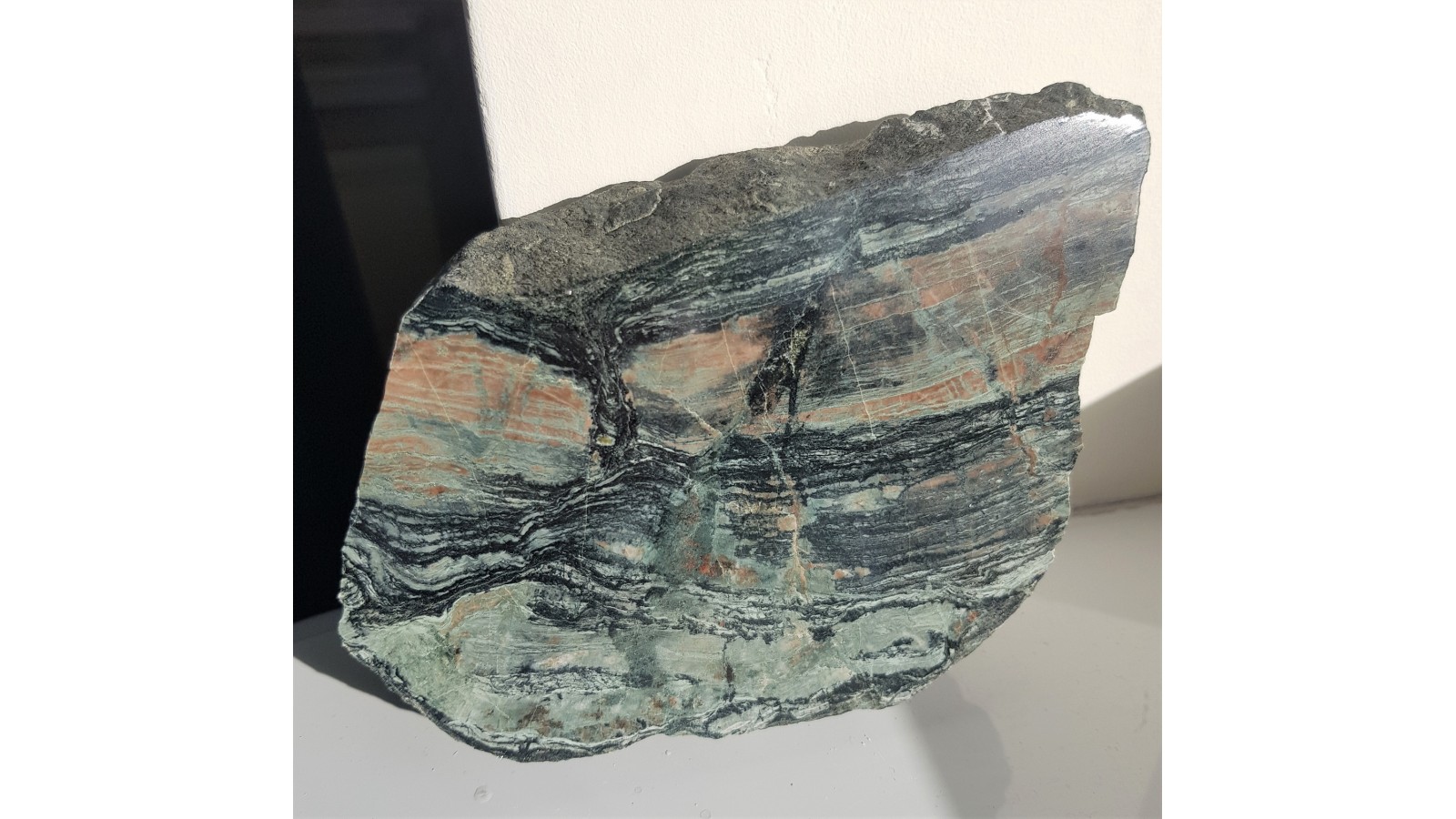 Wyjątkowa, z uwagi na deseń wynikający z budinażu oraz zestawienie barw, skała wapniowo-krzemianowa z dawnej kopalni Vulcan w Kowarach. Duży, polerowany okaz. Piękny poler, strona przeciwa naturalna, nie cięta, wspaniały okaz do kolekcji petrologicznej.